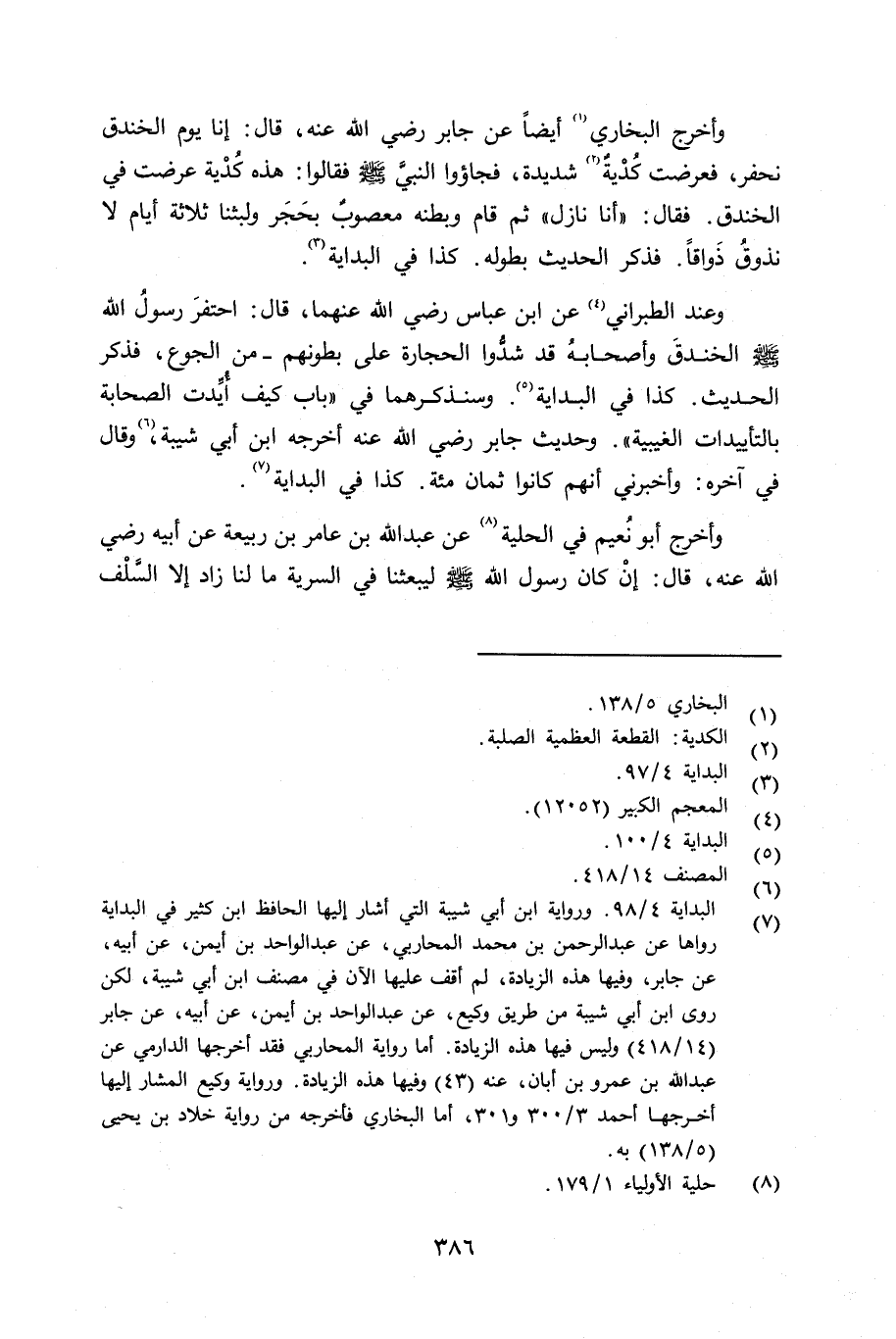 وأخرج البخاري أيضاً عن جابر رضي الله عنه قال: إنا يوم الخندق نحفر، فعرضت كُدْية شديدة، فجاؤوا النبي صلى الله عليه وسلم فقالوا: هذه كُدْية عرضت في الخندق. فقال: «أنا نازل» ثم قام وبطنه معصوب بحجر ولبثنا ثلاثة أيام لا نذوق ذواقاً. فذكر الحديث بطوله. كذا في البداية وعند الطبراني عن ابن عباس رضي الله عنهما قال: إحتفر رسول الله صلى الله عليه وسلم الخندق وأصحابه قد شدُّوا الحجارة على بطونهم - من الجوع، فذكر الحديث. كذا في البداية وسنذكرهما في «باب كيف أُيِّدت الصحابة بالتأييدات الغيبية» . وحديث جابر رضي الله عنه أخرجه ابن أبي شيبة. وقال في آخره: وأخبرني أنهم كانوا ثمان مائة. كذا في البداية.