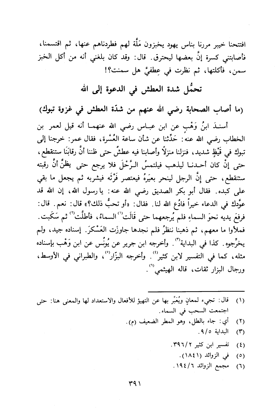 أسند ابن وهْب عن ابن عباس رضي الله عنهما أنه قيل لعمر بن الخطاب رضي الله عنه: حدثنا عن شأن ساعة العُسْرة، فقال عمر: خرجنا إلى تبوك في قَيْظ شديد، فنزلنا منزلاً وأصابنا فيه عطش حتى ظننا أنَّ رقابنا ستنقطع، حتى إنْ كان أحدنا ليذهب فيلتمس الرَّحْل فلا يرجع حتى يظن أنَّ رقبته ستنقطع، حتى إنَّ الرجل لينحر بعيره فيعتصر فَرْثَه فيشربه ثم يجعل ما بقي على كبده. فقال أبو بكر الصديق رضي الله عنه: يا رسول الله، إن الله قد عوَّدك في الدعاء خيراً فادعُ الله لنا. فقال: «أو تحبّ ذلك؟» قال: نعم. قال: فرفع يديه نحو السماء فلم يرجعهما حتى قالت السماء فأطلّت ثم سكبت. فملأوا ما معهم، ثم ذهبنا ننظر فلم نجدها جاوزت العسكر. إسناده جيد، ولم يخرِّجوه. كذا في البداية. وأخرجه ابن جرير عن يونس عن ابن وهب بإسناده مثله، كما في التفسير لابن كثير. وأخرجه البزّار، والطبراني في الأوسط. ورجال البزار ثقات. قال الهيثمي.