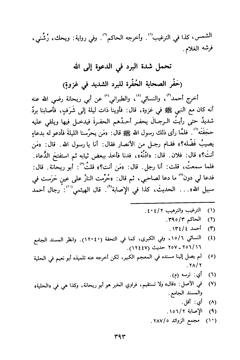 أخرج أحد، والنسائي، والطبراني عن أبي ريحانة رضي الله عنه أنه كان مع النبي صلى الله عليه وسلم في غوة. قال: تحمل شدة البرد في الدعوة إلى اللهفأوينا ذات ليلة إلى شَرَفٍ، فأصابنا برد شديد حتى رأيت الرجال يحفر أحدهم الحفرة فيدخل فيه ويلقي عليه حجَفَتَه. فلمَّا رأى ذلك رسول الله صلى الله عليه وسلم قال: «من يحرسنا الليلة فأدعو له بدعاء يصيب فضله؟» فقام رجل من الأنصار فقال: أنا يا رسول الله. قال: «من أنت؟» قال: فلان. قال: «إدْنُهُ» ، فدنا فأخذ ببعض ثيابه ثم استفتح الدعاء. فلما سمعت: قلت: أنا رجل. قال: «من أنت؟» قال: أبو ريحانة. قال: فدعا لي دون ما دعا لصاحبي، ثم قال: «حُرِّمت النار على عين حرست في سبيل الله» . الحديث. كذا في الإِصابة. قال الهيثمي: رجال أحمد