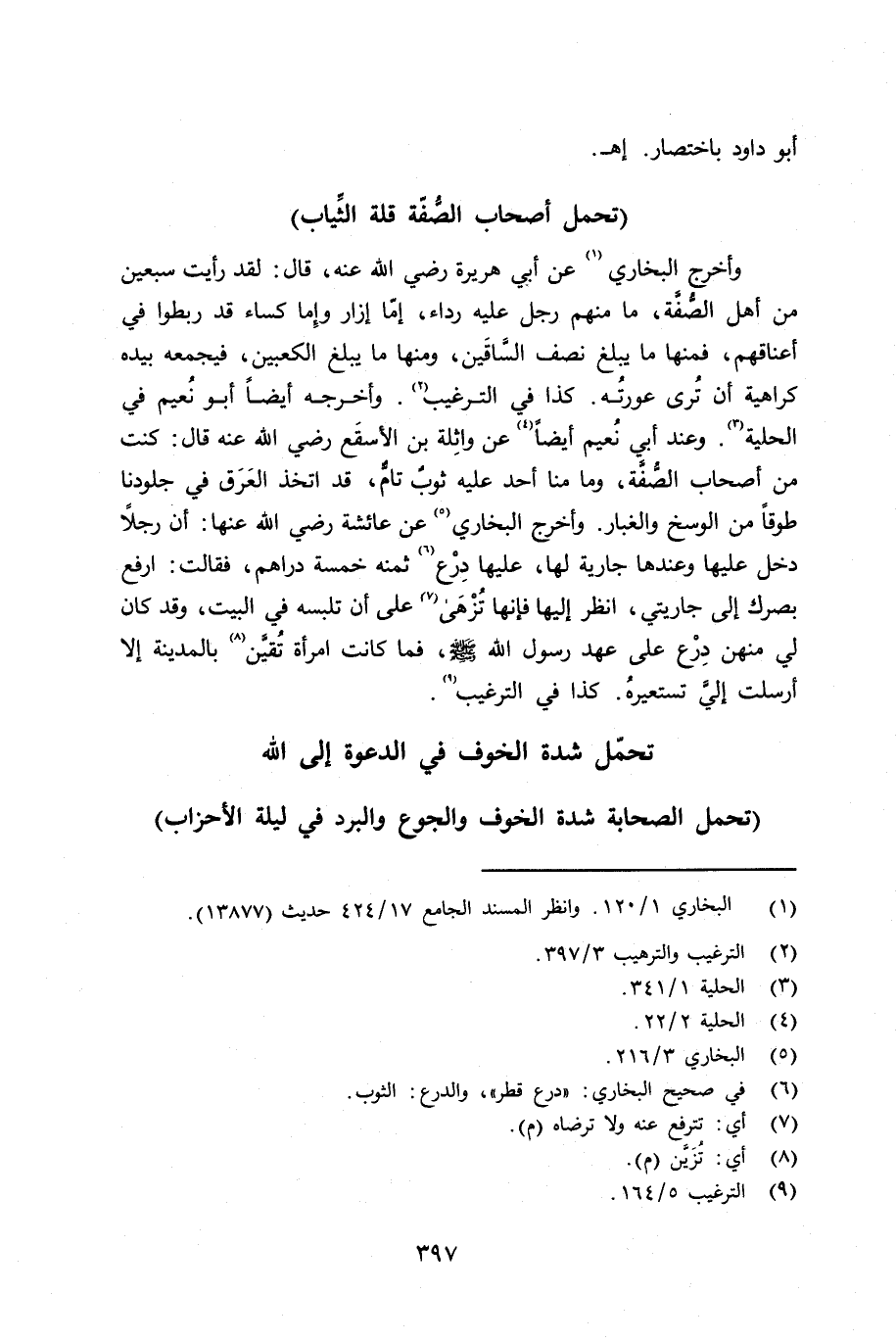 وأخرج البخاري عن أبي هريرة رضي الله عنه قال: لقد رأيت سبعين من أهل الصُّفَّة، ما منهم رجل عليه رداء، إمّا إزار وإِما كساء قد ربطا في أعناقهم، فمنها ما يبلغ نصف السَّاقَين، ومنها ما يبلغ الكعبين، فيجمعه بيده كراهية أن ترى عورته. كذا في الترغيب. وأخرجه أيضاً أبو نُعيم في الحلية. وعند أبي نُعيم أيضاً عن واثِلة بن الأسقَع رضي الله عنه قال: كنت من أصحاب الصُّفَّة، وما منا أحد عليه ثوب تامّ، قد اتخذ العَرَق في جلودنا طوقاً من الوسخ والغبار. وأخرج البخاري عن عائشة رضي الله عنها: أن رجلاً دخل عليها وعندها جارية لها، عليها دِرْع ثمنه خمسة دراهم، فقالت: إرفع بصرك إلى جاريتي، أنظر إليها فإنها تزهو على أن تلبسه في البيت. وقد كان لي منهن درع على عهد رسول الله صلى الله عليه وسلم فما كانت إمرأة تُقينَّ بالمدينة إلا أرسلت إليَّ تستعيره. كذا في الترغيب.