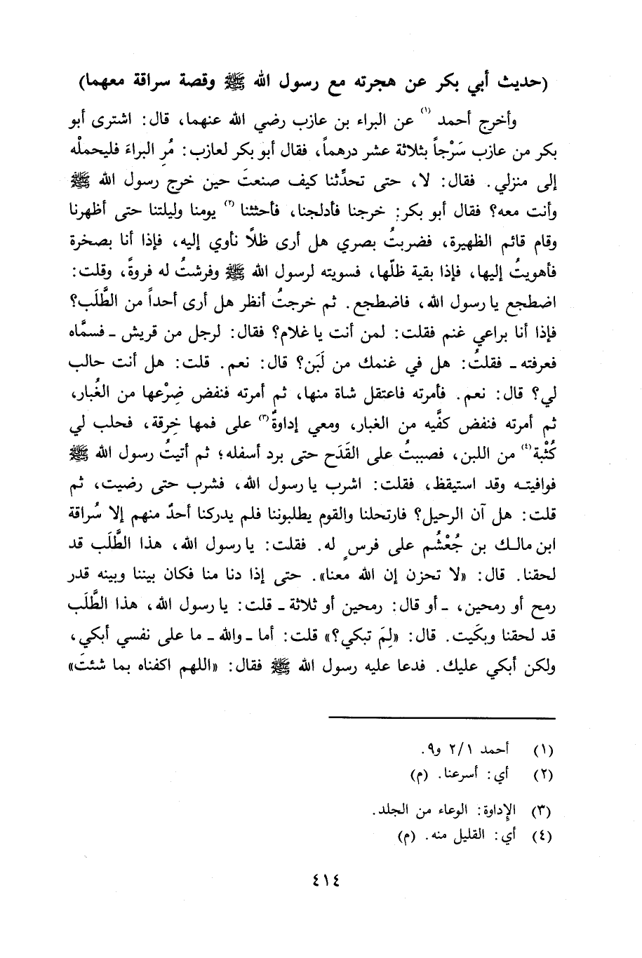 وأخرج أحمد عن البراء بن عازب رضي الله عنهما قال: إشترى أبو بكر من عازب سَرْجاً بثلاثة عشر درهماً، فقال أبو بكر لعازب: مُرِ البراءَ فليحملْه إلى منزلي. فقال: لا، حتى تحدِّثنا كيف صنعتَ حين خرج رسول الله صلى الله عليه وسلم وأنت معه؟ فقال أبو بكر: خرجنا فأدلجنا فأحثثنا يومنا وليلتنا حتى أظهرنا وقام قائم الظهيرة، فضربت بصري هل أرى ظلاً نأوي إِليه، فإذا أنا بصخرة فأهويتُ إليها، فإذا بقية ظلّه، فسويته لرسول الله صلى الله عليه وسلم وفرشت له فروة، وقلت: إضطجع يا رسول الله، فاضطجع. ثم خرجت أنظر هل أرى أحداً من الطَلَب؟ فإذا أنا براعي غنم فقلت: لمن أنت يا غلام؟ فقال: لرجل من قريش - فسمَّاه فعرفته - فقلت: هل في غنمك من لبن؟ قال: نعم. قلت: هل أنت حالب لي؟ قال: نعم. فأمرته فاعتقل شاة منها، ثم أمرته فنفض ضِرْعها من الغبار، ثم أمرته فنفض كفَّيه من الغبار، ومعي إداوةٌ على فمها خِرقة، فحلب لي كُثْبة من اللبن، فصببت على القدح حتى برد أسفله؛ ثم أتيت رسول الله صلى الله عليه وسلم فوافيته وقد استيقظ، فقلت: إشرب يا رسول الله، فشرب حتى رضيت، ثم قلت: هل آن الرحيل؟ فارتحلنا والقوم يطلبوننا فلم يدركنا أحد منهم إلا سراقة بن مالك بن جُعْشُم على فرس له. فقلت: يا رسول الله، هذا الطلب قد لحقنا. قال: «لا تحزن إن الله معنا» ، حتى إذا دنا منا فكان بيننا وبينه قدر رمح أو رمحين، - أو قال: رمحين أو ثلاثة - قلت: يا رسول الله، هذا الطلب قد لحقنا وبكَيت. قال: «لِمَ تبكي؟» قلت: أما - والله - ما على نفسي أبكي، ولكن أبكي عليك. فدعا عليه رسول الله صلى الله عليه وسلم فقال: «اللهم أكفناه بما شئت»
