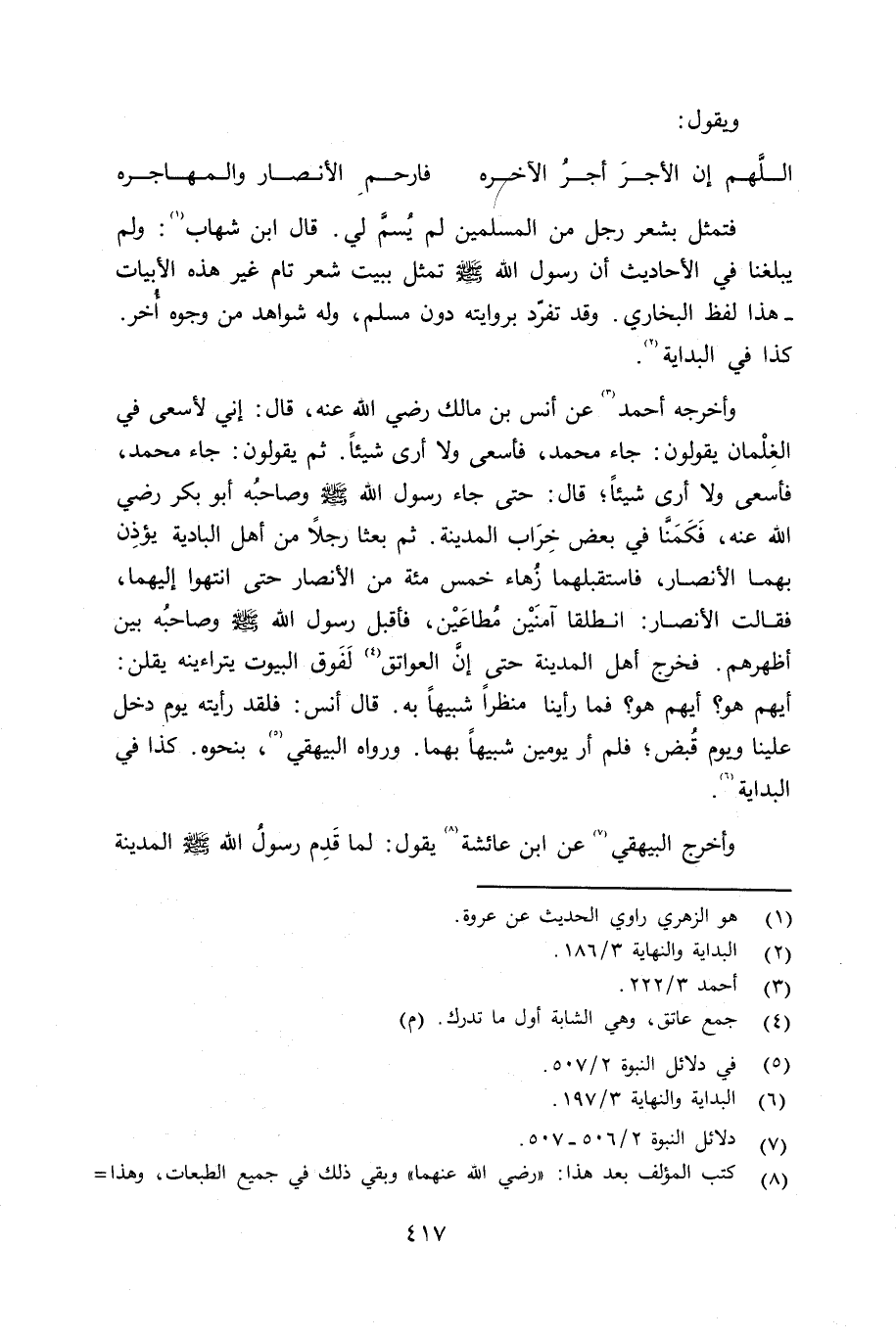 وأخرجه أحمد عن أنس بن مالك رضي الله عنه قال: إِني لأسعى في الغِلْمان يقولون: جاء محمد، فأسعى ولا أرى شيئاً. ثم يقولون: جاء محمد، فأسعى ولا أرى شيئاً؛ قال: حتى جاء رسول الله صلى الله عليه وسلم وصاحبه أبو بكر رضي الله عنه، فَكَمَنَّا في بعض خِرَاب المدينة. ثم بعثا رجلاً من أهل البادية يؤذِن بهما الأنصار، فاستقبلهما زُهَاء خمس مائة من الأنصار حتى انتهوا إليهما، فقالت الأنصار: إنطلقا آمنين مطاعَين، فأقبل رسول الله صلى الله عليه وسلم وصاحبه بين أظهرهم. فخرج أهل المدينة حتى إنَّ العواتق لفوق البيوت يتراأينه يقلن: أيهم هو؟ أيهم هو؟ فما رأينا منظراً شبيهاً به. قال أنس: فلقد رأيته يوم دخل علينا ويوم قُبض؛ فلم أرَ يومين شبيهاً بهما. ورواه البيهقي. بنحوه. كذا في البداية.