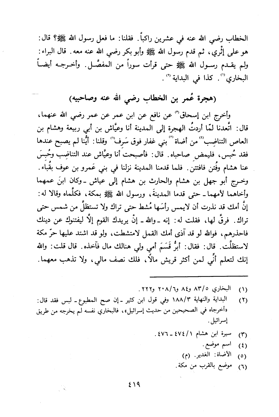 وأخرح ابن إسحاق عن نافع عن ابن عمر عن عمر رضي الله عنهما قال: إتَّعدنا لمّا أردت الهجرة إلى المدينة أنا وعيَّاش بن أبي ربيعة وهشام ابن العاص التناضب من أضاة بني غفار فوق سَرِف وقلنا: أيُّنا لم يصبح عندها فقد حُبس، فليمضِ صاحباه. قال فأصبحت أنا وعيَّاش عند التناضِب وحبس عنا هشام وفتن فافتتن. فلما قدمنا المدينة نزلنا في بني عمرو بن عوف بقُباء. وخرج أبو جهل بن هشام والحارث بن هشام إِلى عياش - وكان ابنَ عنهما وأخاهما لأمهما - حتى قدما المدينة، ورسول الله صلى الله عليه وسلم بمكة، فكلَّماه وقال له: إنَّ أمك قد نذرت أن لا يمس رأسها مُشط حتى تراك ولا تستظلَّ من شمس حتى تراك. فرقَّ لها، فقلت له: إنه - الله - إنْ يريدك القوم إلا ليفتنوك عن دينك فاحذرهم، فوالله لو قد آذى أمك القمل لامتشطت، ولو قد اشتد عليها حرّ مكة لاستظلَّت. قال: فقال: أبرّ قَسَمَ أمي ولي هنالك مال فآخذه. قال قلت: والله إنك لتعلم أنِّي لمن أكثر قريش مالاً، فلك نصف مالي، ولا تذهب معهما.