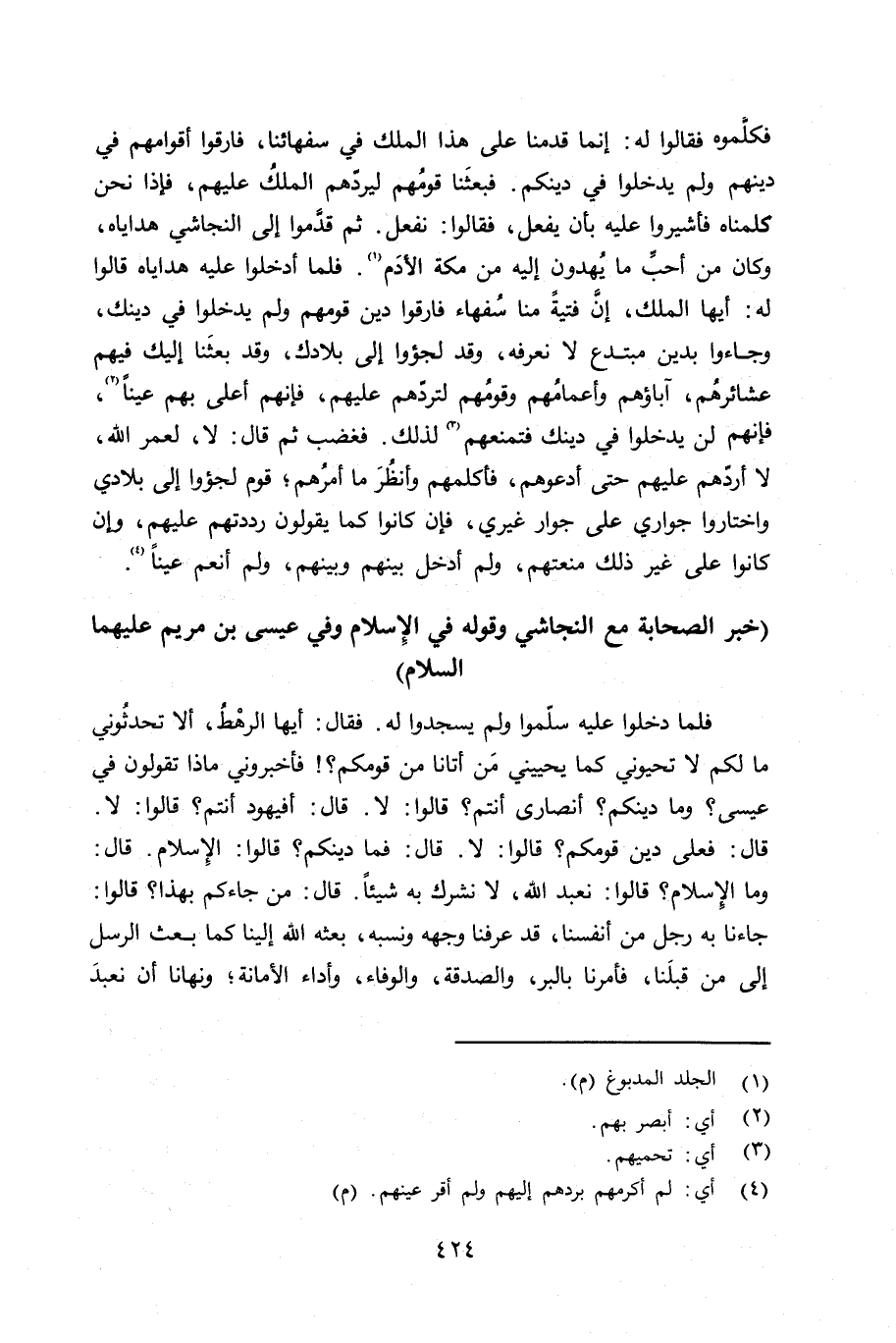فلما دخلوا عليه سلّموا ولم يسجدوا له. فقال: أيها الرهْطُ، ألا تُحدُثُوني ما لكم لا تحيوني كما يحييني من أتانا من قومكم؟ فأخبروني ماذا تقولون في عيسى؟ وما دينكم؟ أنصاري أنتم؟ قالوا؛ لا. قال: أفيهود أنتم؟ قالوا: لا. قال: فعلى دين قومكم؟ قالوا: لا. قال: فما دينكم؟ قالوا: الإِسلام. قال: ما الإِسلام؟ قالوا: نعبد الله، لا نشرك به شيئاً. قال: من جاءكم بهذا؟ قالوا: جاءنا به رجل من أنفسنا، قد عرفنا وجهه ونسبه، بعثه الله إلينا كما بعث الرسل إلى من قبلَنا، فأمرنا بالبر، والصدقة، والوفاء، وأداء الأمانة؛ ونهانا أن نعبد