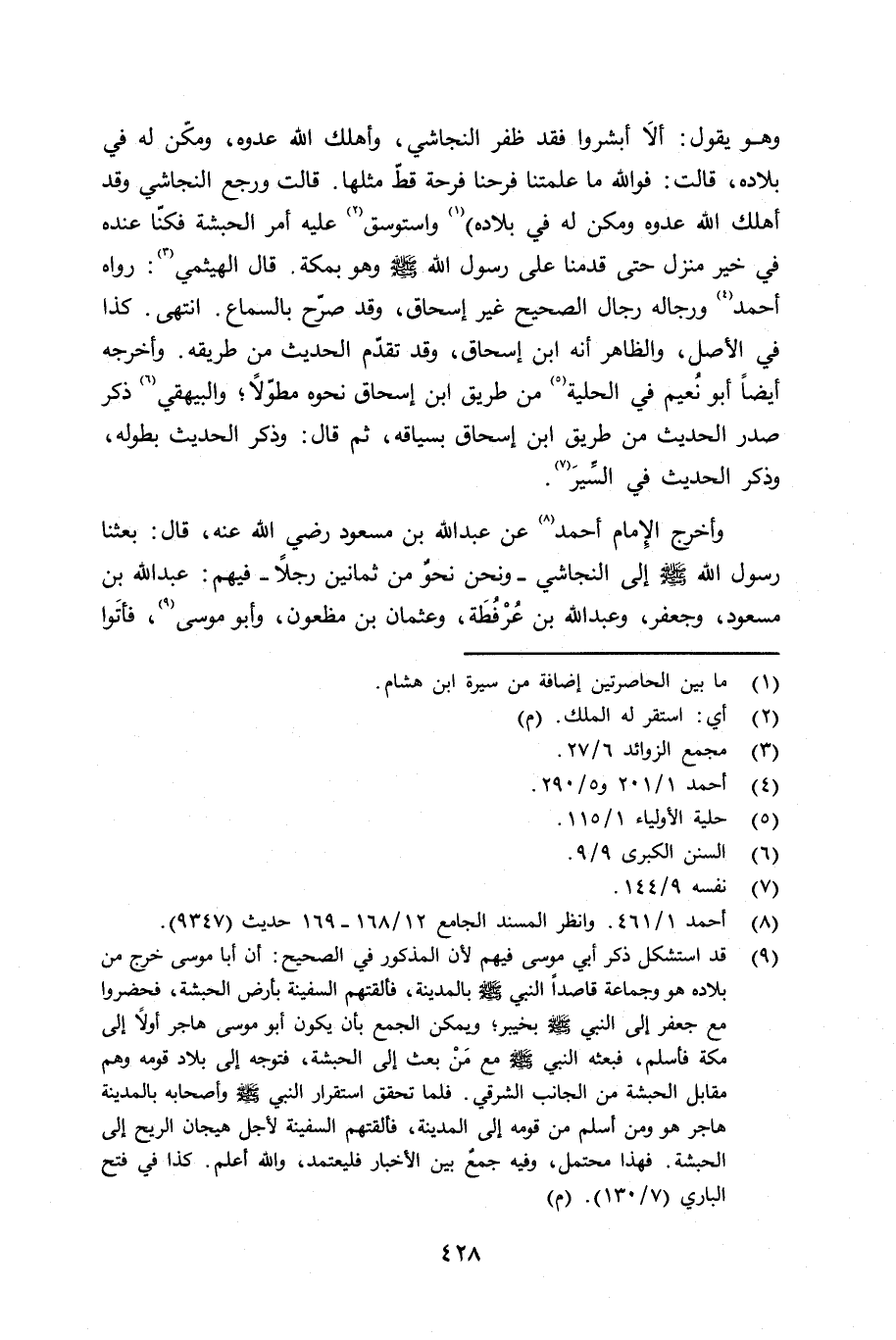 وهو يقول: ألا أبشروا فقد ظفر النجاشي، وأهلك الله عدوه، ومكّن له في بلاده، قالت: فوالله ما علمتنا فرحنا فرحة قطّ مثلها. قالت ورجع النجاشي وقد أهلك الله عدوه ومكن له في بلاده: واستوسق عليه أمر الحبشة فكنّا عنده، في خير منزل حتى قدمنا على رسول الله صلى الله عليه وسلم وهو بمكة. قال الهيثمي: رواه أحمد ورجاله رجال الصحيح غير إسحاق، وقد صرّح بالسماع. انتهى. كذا في الأصل، والظاهر أنه ابن إسحاق، وقد تقدّم الحديث من طريقه. وأخرجه أيضاً أبو نُعيم في الحلية من طريق ابن إسحاق نحوه مطوّلاً؛ والبيهقي ذكر صدر الحديث من طريق ابن إِسحاق بسياقه، ثم قال وذكر الحديث بطوله، وذكر الحديث في السِيَر.