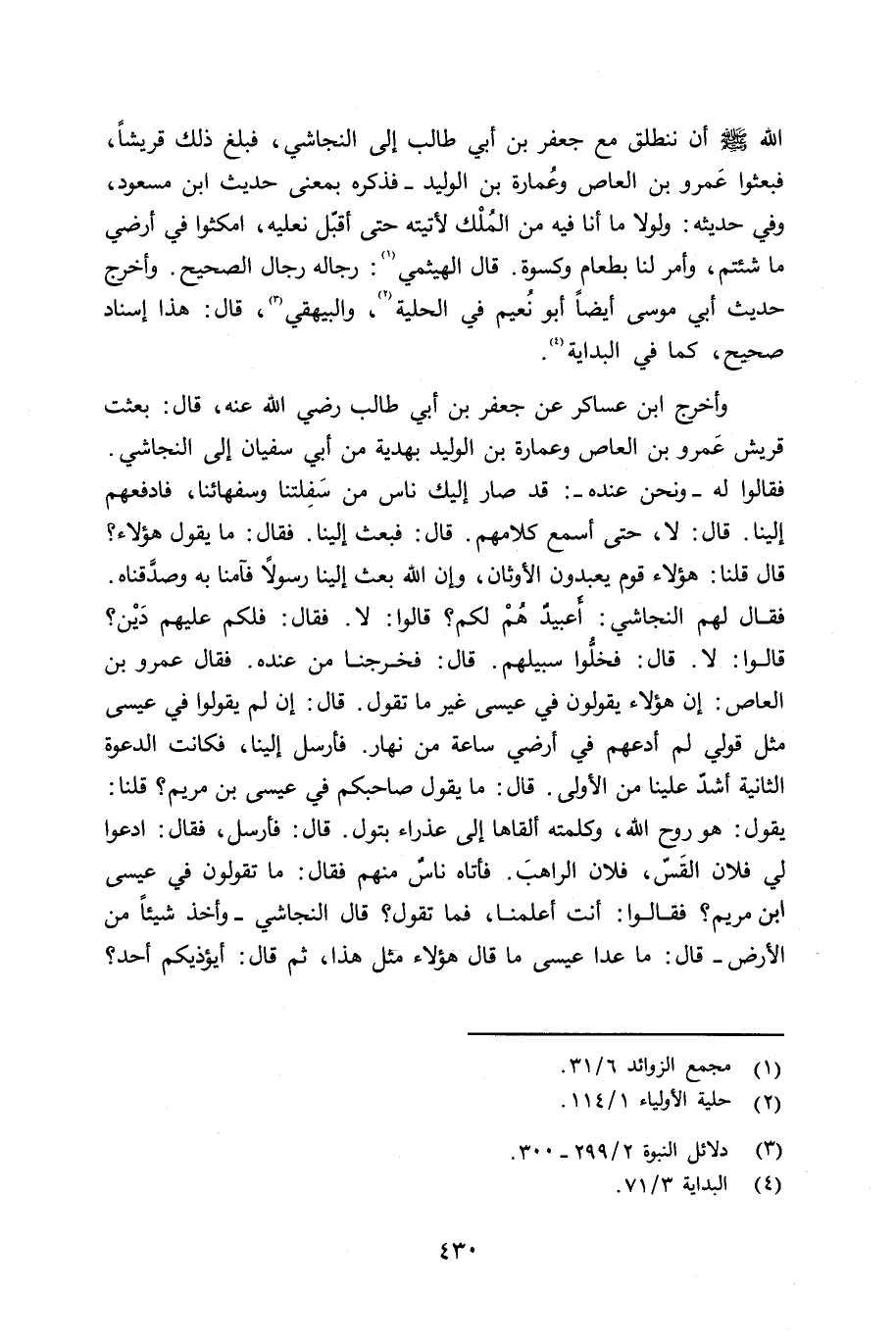 الله صلى الله عليه وسلم أن ننطلق مع جعفر بن أبي طالب إلى النجاشي، فبلغ ذلك قريشاً، فبعثوا عمرو بن العاص، وعُمارة بن الوليد - فذكره بمعنى حديث ابن مسعود، وفي حديثه: ولولا ما أنا فيه من الملك لأتيته حتى أقبّل نعليه، أمكثوا في أرضي ما شئتم، وأمر لنا بطعام وكسوة. قال الهيثمي: رجاله رجال الصحيح. اهـ. وأخرج حديث أبي موسى أيضاً أبو نُعيم في الحلية، والبيهقي قال: هذا إسناد صحيح - كما في البداية.