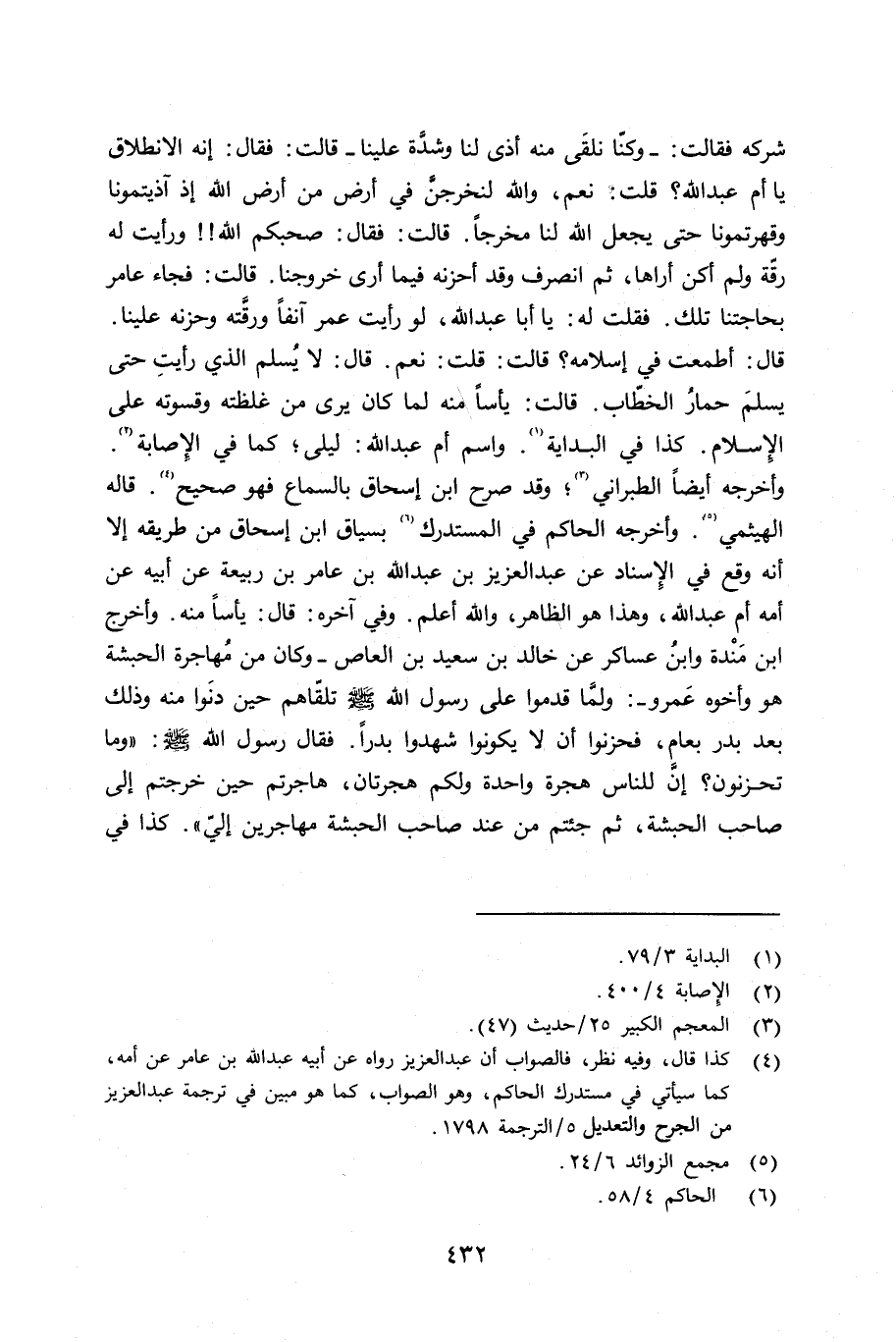 شركه فقالت: - وكنّا نلقَى منه أذى لنا وشدَّه علينا - قالت: فقال: إنه الإنطلاق يا أم عبد الله؟ قلت: نعم، والله لنخرجنَّ في أرض من أرض الله إذ آذيتمونا وقهرتمونا حتى يجعل الله لنا مخرجاً. قالت: فقال: صحبكم الله ورأيت له رقّة لم أكن أراها، ثم انصرف وقد أحزنه فيما أرى خروجنا. قالت: فجاء عامر بحاجتنا تلك. فقلت له: يا أبا عبد الله، لو رأيت عمر آنفاً ورقَّته وحزنه علينا. قال: أطمعت في إسلامه؟ قالت: قلت: نعم. قال: لا يُسلم الذي رأيتِ حتى يسلمَ حمارُ الخطّاب. قالت: يأساً منه لما كان يرى من غلظته وقسوته على الإِسلام. كذا في البداية. وإسم أم عبد الله: ليلى؛ كما في الإِصابة. وأخرجه أيضاً الطبراني؛ وقد صرح ابن إسحاق بالسماع فهو صحيح. قال الهيثمي. وأخرجه الحاكم في المستدرك بسياق ابن إسحاق من طريقه إلا أنه وقع في الإِسناد عن عبد العزيز بن عبد الله بن عامر بن ربيعة عن أبيه عن أمه أم عبد الله، وهذا هو الظاهر - والله أعلم. وفي آخره: قال: يأساً منه. وأخرج ابن مَنْده وابن عساكر عن خالد بن سعيد بن العاص - وكان من مهاجرة الحبشة هو وأخوه عمرو -: ولمَّا قدموا على رسول الله صلى الله عليه وسلم تلقّاهم حين دنوا منه وذلك بعد بدر بعام، فحزنوا أن لا يكونوا شهدوا بدراً. فقال رسول الله صلى الله عليه وسلم «وما تحزنون؟ إنَّ للناس هجرة واحدة ولكم هجرتان، هاجرتم حين خرجتم إلى صاحب الحبشة، ثم جئتم من عند صاحب الحبشة مهاجرين إِليّ» . كذا في