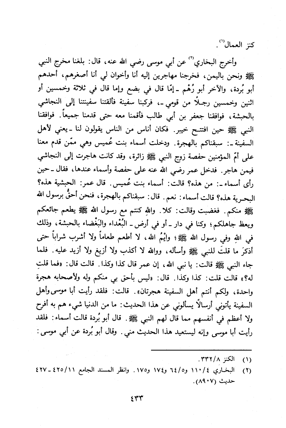 وأخرج البخاري عن أبي موسى رضي الله عنه قال: بلغنا مخرج النبي صلى الله عليه وسلم ونحن باليمن، فخرجنا مهاجرين إِليه أن وأخوان لي أنا أصغرهم، أحدهم أبو بُردة، والآخر أبو رُهم - إِمّا قال في بضع وإِما قال في ثلاثة وخمسين أو إثنين وخمسين رجلاً من قومي -، فركبنا سفينة فألقتنا سفينتنا إِلى النجاشي بالحبشة، فوافقنا جعفر بن أبي طالب فأقمنا معه حتى قدمنا جميعاً. فوافقنا النبي صلى الله عليه وسلم حين افتتح خيبر. فكان أناس من الناس يقولون لنا - يعني لأهل السفينة -: سبقناكم بالهجرة. ودخلت أسماء بنت عُميس وهي ممّن قدم معنا على أمّ المؤمنين حفصة زوج النبي صلى الله عليه وسلم زائرة، وقد كانت هجرت إِلى النجاشي فيمن هاجر. فدخل عمر رضي الله عنه على حفصة وأسماء عندها، فقال - حين رأى أسماء -: من هذه؟ قلت: أسماء إبنة عُميس. قال عمر: الحبشية هذه؟ البحرية هذه؟ قالت أسماء: نعم. قال: سبقناكم بالهجرة، فنحن أحقُّ برسول الله صلى الله عليه وسلم منكم. فغضبت وقالت: كلا. والله كنتم مع رسول الله صلى الله عليه وسلم يطعم جائعكم ويعظ جاهلكم؛ وكنا في دار - أو في أرض - البعداء والبغضاء بالحبشة، وذلك في الله وفي رسول الله صلى الله عليه وسلم وأيْمُ الله، لا أطعم طعاماً لا أشرب شراباً حتى أذكرَ ما قلتَ للنبي صلى الله عليه وسلم وأسأله، ووالله لا أكذب ولا أزيغ ولا أزيد عليه. فلما جاء النبي صلى الله عليه وسلم قالت: يا نبي الله، إِن عمر قال كذا وكذا. قالت قال: «فما قلتِ له؟» قالت قلت: كذا وكذا. قال: «ليس بأحق بي منكم وله ولأصحابه هجرة واحدة، ولكم أنتم أهل السفينة هجرتان» . قالت: فلقد رأيت أبا موسى وأهل السفينة يأتوني أرسالاً يسألوني عن هذا الحديث: ما من الدنيا شيء هم به أفرح ولا أعظم في أنفسهم مما قال لهم النبي صلى الله عليه وسلم قال أبو بُردة قالت أسماء: فلقد رأيت أبا موسى وإنه ليستعيد هذا الحديث