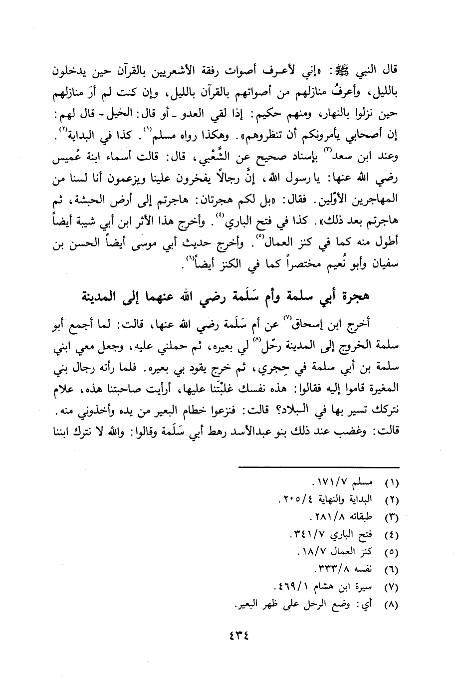 قال النبي صلى الله عليه وسلم «إني لأعرف أصوات رفقة الأشعريين بالقرآن حين يدخلون بالليل، وأعرف منازلهم من أصواتهم بالقرآن بالليل، وإن كنت لم أرَ منازلهم حين نزلوا بالنهار، ومنهم حكيم: إذا لقي العدو - أو قال: الخيل - قال لهم: إن أصحابي يأمرونكم أن تنظروهم» . وهكذا رواه مسلم. كذا في البداية. عند ابن سعد بإسناد صحيح عن الشَّعْبي قال: قالت أسماء إبنة عُميس رضي الله عنها: يا رسول الله، إِنَّ رجالاً يفخرون علينا ويزعمون أنا لسنا من المهاجرين الأوّلين، فقال: بل لك هجرتان: هاجرتم إلى أرض الحبشة، ثم هاجرتم بعد ذلك» . كذا في فتح الباري. وأخرج هذا الأثر ابن أبي شيبة أيضاً أطول منه كما في كنز العمال. وأخرج حديث أبي موسى أيضاً الحسن بن سفيان، وأبو نُعيم مختصراً كما في الكنز أيضاً.