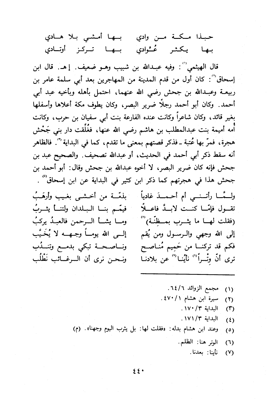 قال الهيثمي: وفيه عبد الله بن شبيب وهو ضعيف اهـ. قال ابن إسحاق: كان أول من قدم المدينة من المهاجرين بعد أبي سلمة عامر بن ربيعة، وعبد الله بن جحش رضي الله عنهما، احتمل بأهله وبأخيه عبد أبي أحمد. وكان أبو أحمد رجلاً ضرير البصر، وكان يطوف مكة أعلاها وأسفلها بغير قائد، وكان شاعراً وكانت عنده الفارعة بنت أبي سفيان بن حرب، وكانت أُمه أميمة بنت عبد المطلب بن هاشم رضي الله عنها فخلِّقت دار بني جحش هجرة، فمرّ بها عتبة فذكر قصتهم بمعنى ما تقدم كما في البداية. فالظاهر أنه سقط ذكر أبي أحمد في الحديث، أو عبد الله تصحيفاً. والصحيح عبد بن جحش فإنه كان ضرير البصر، لا أخو. عبد الله بن جحش وقال: أبو أحمد بن جحش هذا في هجرتهم كما ذكر ابن كثير في البداية عن ابن إسحاق: