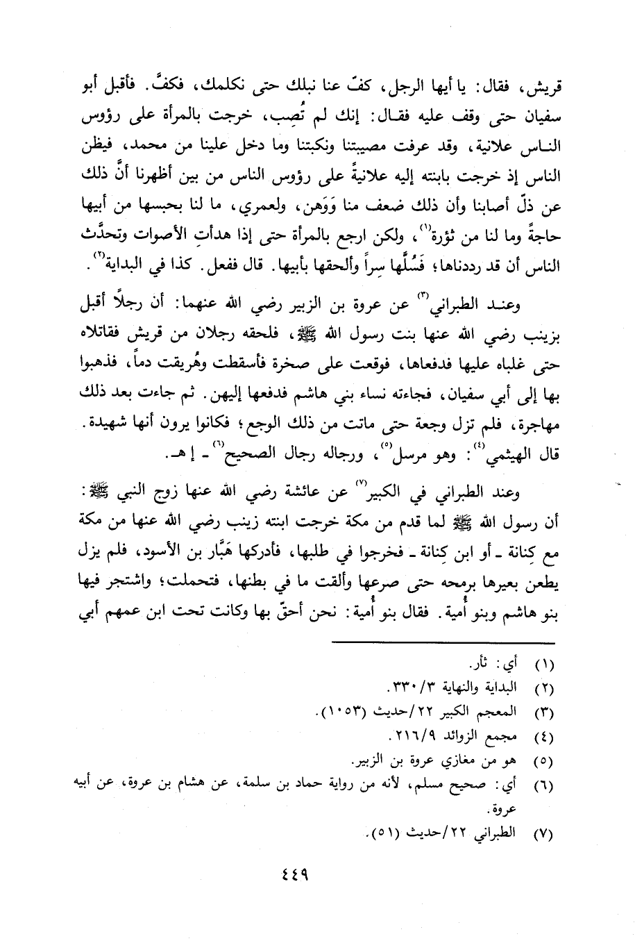 وعند الطبراني عن عروة بن الزبير رضي الله عنهما: أن رجلاً أقبل بزينب رضي الله عنها بنت رسول الله صلى الله عليه وسلم فلحقه رجلان من قريش فقاتلاه حتى غلباه عليها فدفعاها، فوقعت على صخرة فأسقطت وهُريقت دماً، فذهبوا بها إلى أبي سفيان، فجاءته نساء بني هاشم فدفعها إِليهن. ثم جاءت بعد ذلك مهاجرة، فلم تزل وجعة حتى ماتت من ذلك الوجع؛ فكانوا يرون أنها شهيدة. قال الهيثمي: وهو مرسل، ورجاله رجال الصحيح اهـ.