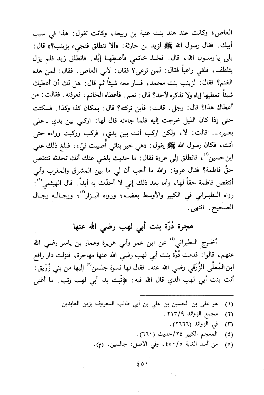 العاص؛ وكانت عند هند بنت عتبة بن ربيعة، وكانت تقول: هذا في سبب أبيك. فقال رسول الله صلى الله عليه وسلم لزيد بن حارثة؛ «ألا تنطلق فتجيء بزينب؟» قال: بلى يا رسول الله، قال: فخذ خاتمي فأعطِها إِيَّاه. فانطلق زيد فلم يزل يتلطف، فلقي راعياً فقال: لمن ترعى؟ فقال لأبي العاص. فقال: لمن هذه الغنم؟ فقال: لزينب بنت محمد، فسار معه شيئاً ثم قال: هل لك أن أعطيك شيئاً تعطيها إياه ولا تذكره لأحد؟ قال: نعم. فأعطاه الخاتم، فعرفته. فقالت: من أعطاك هذا؟ قال: رجل. قالت: فأين تركته؟ قال: بمكان كذا وكذا. فسكتت حتى إذا كان الليل خرجت إِليه فلما جاءته قال لها: إركبي بين يدي - على بعيره -. قالت: لا، ولكن إركب أنت بين يدي، فركب وركبت وراءه حتى أتت، فكان رسول الله صلى الله عليه وسلم يقول: «هي خير بناتي أُصيبت فيّ» فبلغ ذلك علي بن حسين رضي الله عنهما، فانطلق إلى عروة فقال: ما حديث بلغني عنك أنك تحدثه تنتقص حقَّ فاطمة؟ فقال عروة: والله ما أحب أن لي ما بين المشرق والمغرب وأني أنتقص فاطمة حقاً لها، وأما بعد ذلك إِني لا أحدّث به أبداً. قال الهيثمي: روه الطبراني في الكبير والأوسط بعضه؛ ورواه البزار؛ ورجاله رجال الصحيح. انتهى.