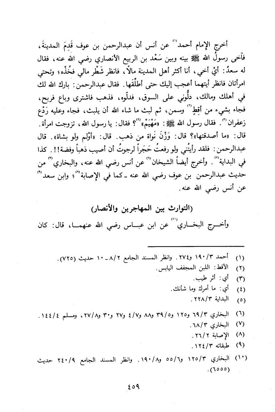 أخرج الإِمام أحمد عن أنس أن عبد الرحمن بن عوف قدم المدينة، فآخى رسول الله صلى الله عليه وسلم بينه وبين سعد بن الربيع الأنصاري رضي الله عنه، فقال له سعد: أيْ أخي، أنا أكثر أهل المدينة مالاً، فانظر شَطْر مالي فُخْذه؛ وتحتي إمرأتان فانظر أيتهما أعجب إليك حتى أطلِّقَها. فقال عبد الرحمن: بارك الله لك في أهلك ومالك، دلُّوني على السوق، فدلّوه، فذهب فاشترى وباع فربح، فجاء بشيء من أقِطٍ وسمن، ثم لبث ما شاء الله أن يلبث، فجاء وعليه رَدْع زعفران. فقال رسول الله صلى الله عليه وسلم «مَهْيَمْ» ؟ فقال: يا رسول الله، تزوجت إمرأة. قال: «ما أصدقتها» ؟ قال: وَزْنَ نَواة من ذهب. قال: «أوْلم ولو بشاة» . قال عبد الرحمن: فلقد رأيتُني ولو رفعتُ حَجَراً لرجوتُ أن أصيب ذهباً وفضة. كذا في البداية. وأخرجه أيضاً الشيخان عن أنس رضي الله عنه، والبخاري من حديث عبد الرحمن بن عوف رضي الله عنه - كما في الإِصابة؛ وابن سعد عن أنس رضي الله عنه.