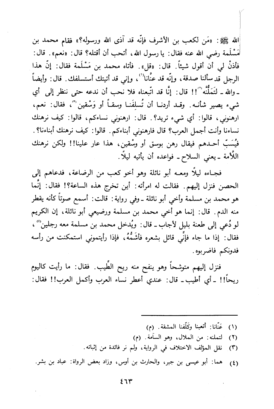 الله صلى الله عليه وسلم «من لكعب بن الأشرف فإنّه قد آذى الله ورسوله؟» فقام محمد بن مَسْلَمة رضي الله عنه فقال: يا رسول الله، أتحب أن أقتله قال: «نعم» . قال: فأذنْ لي أن أقول شيئاً. قال: «قل» . فأتاه محمد بن مَسْلَمة فقال: إنّ هذا الرجل قد سألَنا صدقة، وإنّه قد عنَّانا، وإني قد أتيتك أستسلفك. قال: وأيضاً - والله - لتَمَلُّنَّه قال: إنَّا قد اتّبعناه فلا نحب أن ندعه حتى ننظر إلى أي شيء يصير شأنه. وقد أردنا أن تُسلِفَنا وسقاً أو وَسْقين، فقال: نعم، إرهنوني، قالوا: أي شيء تريد؟. قال: إرهنوني نساءكم، قالوا: كيف نرهنك نساءنا وأنت أجمل العرب؟ قال: فارهنوني أبناءكم. قالوا: كيف نرهنك أبناءنا؟. فيُسَبّ أحدهم فيقال رهن بوسق أو وسْقين، هذا عار علينا ولكن نرهنك اللأَمة - يعني السلاح - فواعده أن يأتيه ليلاً.
