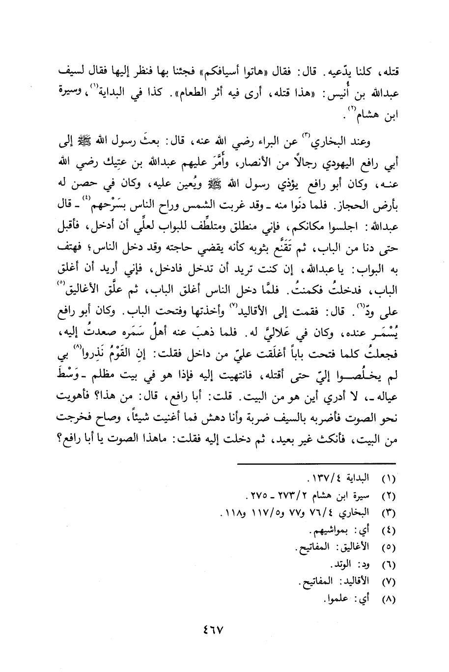 وعند البخاري عن البراء رضي الله عنه قال: بعث رسول الله صلى الله عليه وسلم إلى أبي رافع اليهودي رجالاً من الأنصار، وأمّر عليهم عبد الله بن عتِيك رضي الله عنه، وكان أبو رافع يؤذي رسول الله صلى الله عليه وسلم ويُعين عليه، وكان في حصن له بأرض الحجاز. فلما دَنوا منه - وقد غربت الشمس وراح الناس بسَرْحهم - قال عبد الله: إجلسوا مكانكم، فإني منطلق ومتلطِّف للبواب لعلِّي أن أدخل، فأقبل حتى دنا من الباب، ثم تقنع بثوبه، كأنه يقضي حاجته وقد دخل الناس؛ فهتف به البواب: يا عبد الله، إن كنت تريد أن تدخل فادخل، فإني أريد أن أغلق الباب، فدخلتُ فكمنتُ. فلمَّا دخل الناس أغلق الباب، ثم علَّق الأغاليق على ودّ. قال: فقمت إلى الأقاليد وأخذتها وفتحت الباب. وكان أبو رافع يُسمَر عنده، وكان في عَلاليَّ له. فلما ذهب عنه أهل سَمَره صعدت إليه، فجعلت كلما فتحت باباً أغلَقت عليّ من داخل فقلت: إِن القومُ نذروا بي لم يخلُصوا إليّ حتى أقتله، فانتهيت إِليه فإذا هو في بيت مظلم - وَسْطَ عياله -، لا أدري أين هو من البيت. قلت: أبا رافع، قال: من هذا؟ فأهويت نحو الصوت فأضربه بالسيف ضربة وأنا دهش فما أغنيت شيئاً، وصاح فخرجت من البيت، فأمكث غير بعيد، ثم دخلت إليه فقلت: ما هذا الصوت يا أبا رافع؟
