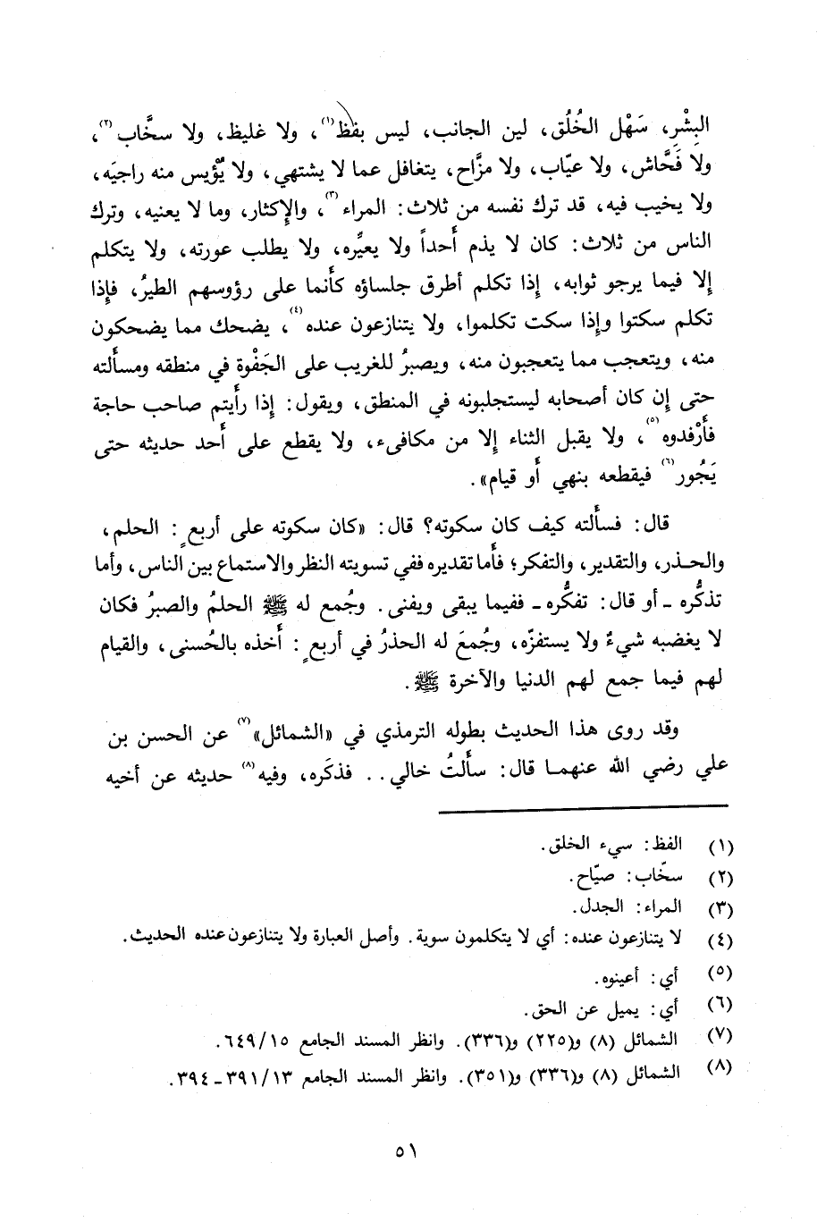 قال: فسأَلته كيف كان سكوته؟ قال «كان سكوته على أربع: الحلم، والحذر، التقدير، والتفكر؛ فأَما تقديره ففي تسويته النظر والإستماع بين الناس، وأمَّا تذكُّره - أو قال: تفكُّره - ففيما يبقى ويفنى. وجُمع له صلى الله عليه وسلم الحلم والصبر فكان لا يغضبه شيء ولا يستفزّه. وجُمَع له الحذر في أربع: أَخذه بالحسنى، والقيامُ لهم فيما جمع لهم الدنيا الآخرة صلى الله عليه وسلم