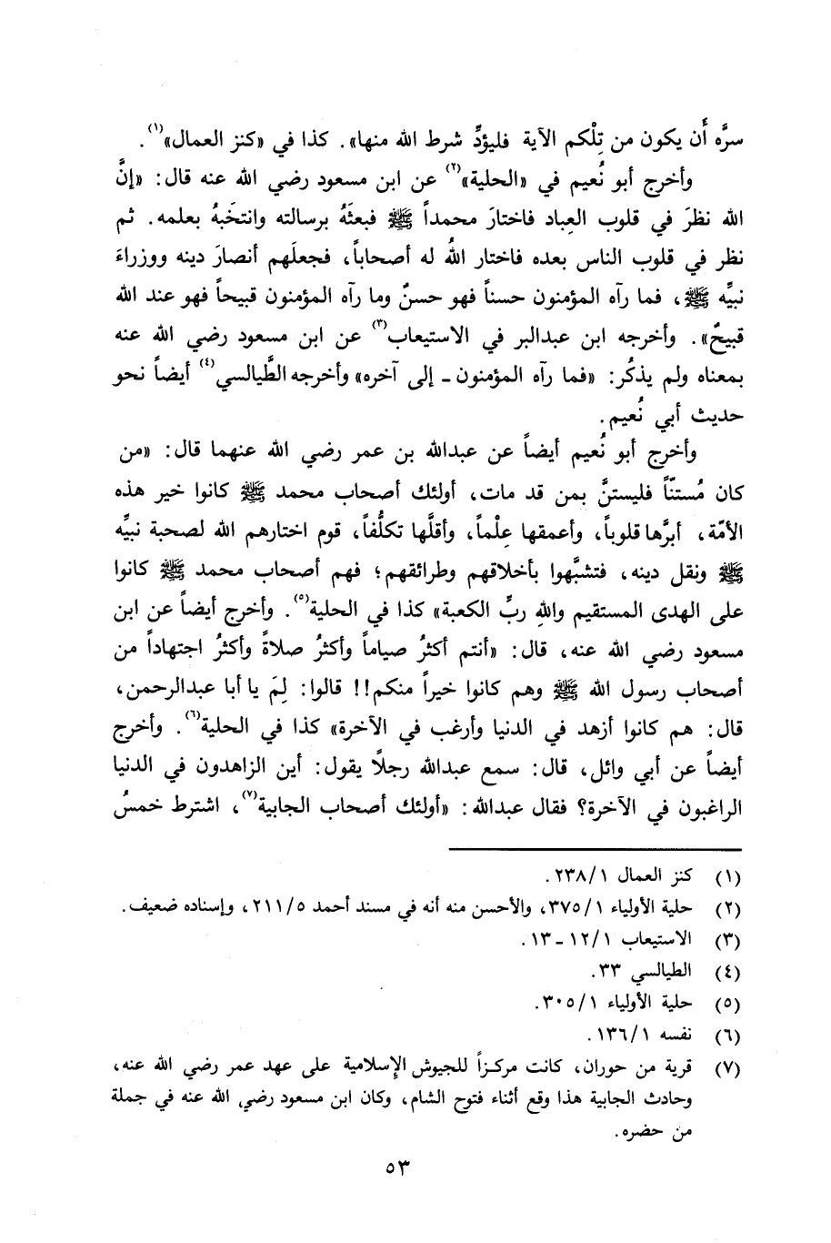وأَخرج أبو نُعيم أَيضاً عن عبد الله بن عمر رضي الله عنهما قال: (من كان مُستنّاً فليستنَّ بمن قد مات، أولئك أَصحاب محمد صلى الله عليه وسلم كانوا خير هذه الأمّة، أبرَّها قلوباً، وأعمقها علماً، وأقلَّها تكلُّفاً، قوم اختارهم الله لصحبة نبيِّه صلى الله عليه وسلم ونقل دينه، فتشبَّهوا بأَخلاقهم وطرائقهم؛ فهم أصحاب محمد صلى الله عليه وسلم كانوا على الهدى المستقيم والله ربِّ الكعبة: كذا في الحلية وأَخرج أَيضاً عن ابن مسعود رضي الله عنه قال: (أنتم أَكثرُ صياماً وأَكثرُ صلاةً وأَكثرُ اجتهاداً من أَصحاب رسول الله صلى الله عليه وسلم وهم كانوا خيراً منكم قالوا: لِمَ يا أبا عبد الرحمن، قال: هم كانوا أزهد في الدنيا وأَرغب في الآخرة) كذا في الحلية. وأخرج أيضاً عن أَبي وائل قال: سمع عبد الله رجلاً يقول: أين الزاهدون في الدنيا الراغبون في الآخرة؟ فقال عبد الله: (أولئك أَصحاب الجابية، اشترط خمسُ