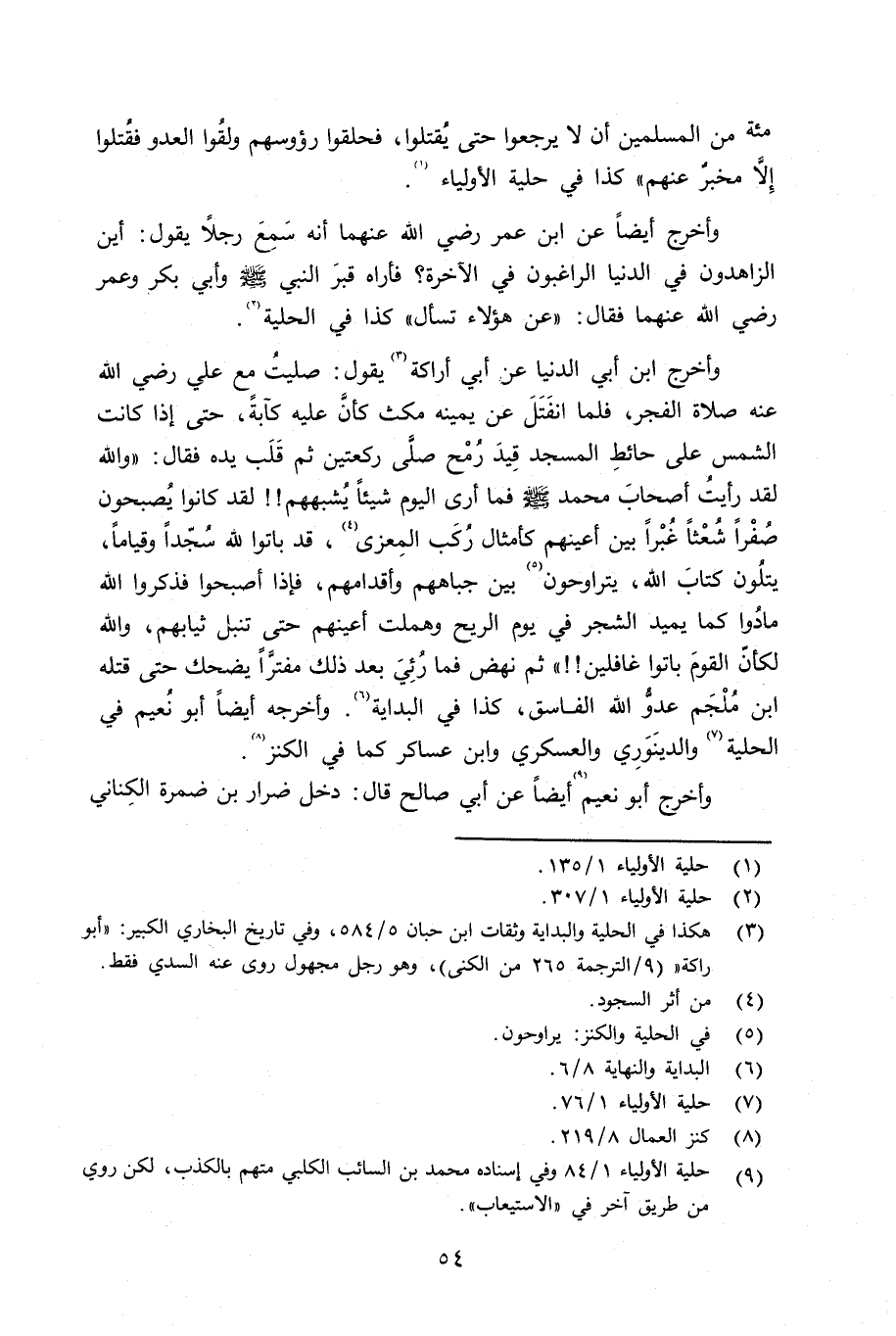 وأَخرج ابن أَبي الدنيا عن أَبي أَراكة يقول: صليتُ مع علي رضي الله عنه صلاة الفجر، فلما انفَتَلَ عن يمينه مكث كأَنَّ عليه كآبةً، حتى إِذا كنت الشمس على حائِط المسجد قِيدَ رُمْح صلَّى ركعتين ثم قَلَب يده فقال: (والله لقد رأَيت أصحاب محمد صلى الله عليه وسلم فما أرى اليوم شيئاً يُشبههم لقد كانوا يُصبحون صُفْراً شُعْثاً غُبْراً بين أعينهم كأَمثال رُكَب المِعزى، قد باتوا لله سُجّداً وقياماً، يتلُون كتاب الله، يتراوحون بين جباهم وأقدامهم، فإِذا أَصبحوا فذكروا الله مادُوا كما يميد الشجر في يوم الريح وهملت أعينهم حتى تنبل ثيابهم، والله لكأَنّ القومَ باتوا غافلين) ثم نهض فما رُئِيَ بعد ذلك مفترَّاً يضحك حتى قتله ابن مُلْجَم عدوُّ الله الفاسق، كذا في البداية. وأخرجه أيضاً أبو نُعيم في الحلية والدينَوَرِي والعسكري وابن عساكر كما في الكنز.