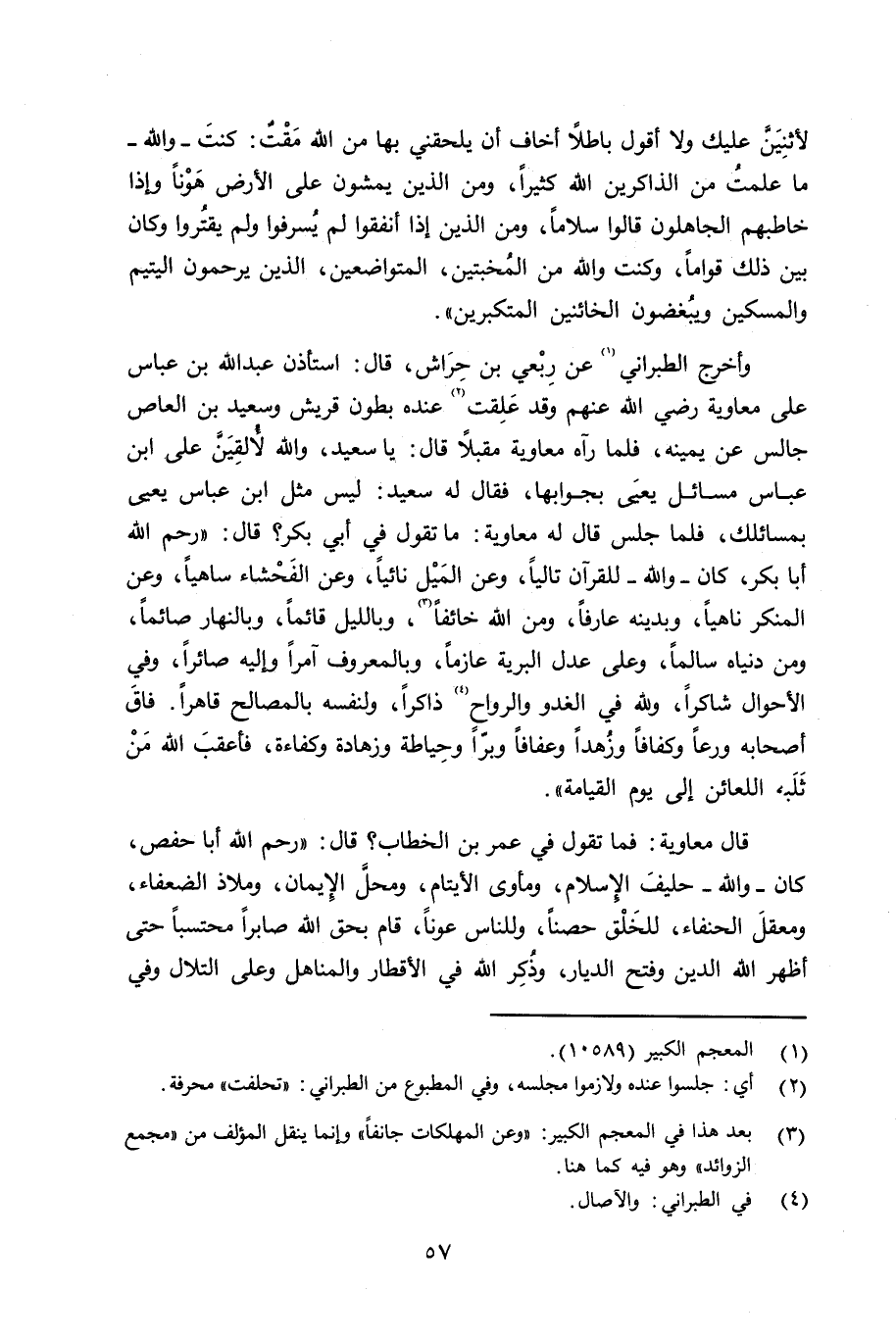 وأخرج الطبراني عن رِبْعي بن حِرَاش قال استأذن عبد الله ابن عباس على معاوية رضي الله عنهم وقد عَلِقت عنده بطون قريش وسعيد ابن العاص جالس عن يمينه، فلما رآه معاوية مقبلاً قال: يا سعيد، والله لأُلقِيَنَّ على ابن عباس مسائل يعيَى بجوابها، فقال له سعيد: ليس مثل ابن عباس يعيى بمسائلك، فلما جلس قال له معاوية: ما تقول في أَبي بكر؟ قال: (رحم الله أبا بكر، كان - والله للقرآن تالياً، وعن المَيْل نائياً، وعن الفحشاء ساهياً، وعن المنكر ناهياً، وبدينه عارفاً، ومن الله خائفاً. وبالليل قائماً، وبالنهار صائماً، ومن دنياه سالماً وعلى عدل البرية عازماً، وبالمعروف آمراً وإِليه صائراً، وفي الأحوال شاكراً، ولله في الغدو والرواح ذاكراً، ولنفسه بالمصالح قاهراً. فاق أَصحابه ورعاً وكفافاً وزهداً وعفافاً وبرّاً وحِياطة زهادة وكفاءة، فأعقبَ الله مَنْ ثَلَبه اللعائن إِلى يوم القيامة) .