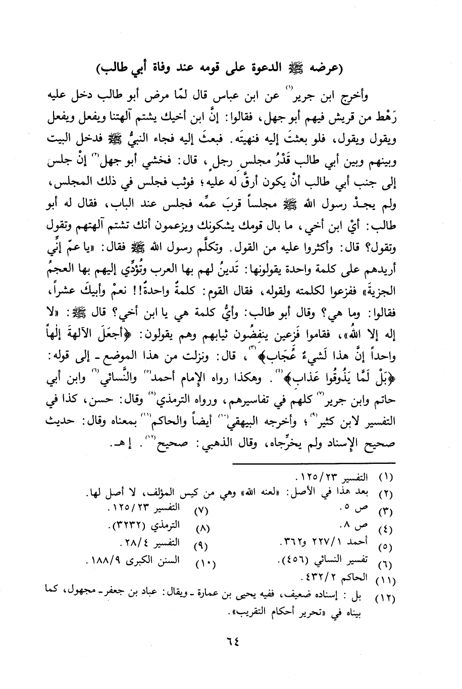 وأخرج ابن جرير عن ابن عباس قال لمّا مرض أبو طالب دخل عليه رَهْط من قريش فيهم أَبو جهل فقالوا: إِنَّ ابن أخيك يشتم آلهتنا ويفعل ويفعل ويقول ويقول، فلو بعثتَ إِليه فنهيتَ. فبعث إِليه فجاء النبي صلى الله عليه وسلم فدخل البيت وبينهم وبين أَبي طالب قَدْرُ مجلسِ رجلٍ، قال: فخشي أبو جهل - لعنهُ الله - إِنْ جلس إِلى جنب أبي طالب أَنْ يكون أَرقَّ له عليه؛ فوثب فجلس في ذلك المجلس، ولم يجدْ رسول الله صلى الله عليه وسلم مجلساً قربَ عمِّه فجلس عند الباب، فقال له أبو طالب: أيْ ابن أخي، ما بال قومك يشكونك ويزعمون أَنك تشتم آلهتهم وتقول وتقول؟ قال: وأَكثروا عليه من القول. وتكلَّم رسول الله صلى الله عليه وسلم فقال: «يا عمّ إِنِّي أريدهم على كلمة واحدة يقولونها؛ تَدينُ لهم بها العرب وتُؤدِّي إِليهم بها العجمُ الجزيةَ» ففزعوا لكلمته ولقوله، فقال القوم: كلمة واحدة نعمْ وأَبيكَ عشراً، فقالوا: وما هي؟ وقال أَبو طالب: وأَيُّ كلمة هي يا ابن أخي؟ قال صلى الله عليه وسلم «لا إِله إِلا الله» ، فقاموا فَزِعين ينفِضُون ثيابهم وهم يقولون: {أَجَعَلَ الاْلِهَةَ الهاً واحِداً إِنَّ هَاذَا لَشَىْء عُجَابٌ} (ص: 5) ، قال: ونزلت من هذا الموضع - إِلى قوله: {بَل لَّمَّا يَذُوقُواْ عَذَابِ} (ص: 8) . وهكذا رواه الإِمام أحمد والنِّسائي وابن أَبي حاتم وابن جرير كلهم في تفاسيرهم، ورواه الترمذي وقال: حسن، كذا في التفسير لابن كثير؛ وأَخرجه البيهقي أَيضاً والحاكم بمعناه وقال: حديث صحيح الإِسناد ولم يخرِّجاه، وقال الذهبي: صحيح اهـ.