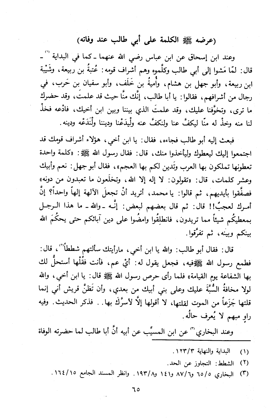 قال: فقال أبو طالب: الله يا ابن أخي، ما رأيتك سألتهم شططاً، قال: فطمع رسول الله صلى الله عليه وسلم فيه، فجعل يقول له: أَيْ عم، فأنت فقُلْها إستحلُّ لك بها الشفاعة يوم القيامة» فلما رأى حرص رسول الله صلى الله عليه وسلم قال: يا ابن أخي. والله لولا مخافةُ السُبَّة عليك وعلى بني أبيك من بعدي، وأَن تظنَّ قريش أني إِنما قلتها جَزَعاً من الموت لقلتها، لا أقلها إلا لأسرَّكَ بها.. فذكر الحديث.. وفيه راوٍ مبهم لا يُعرف حالُه.