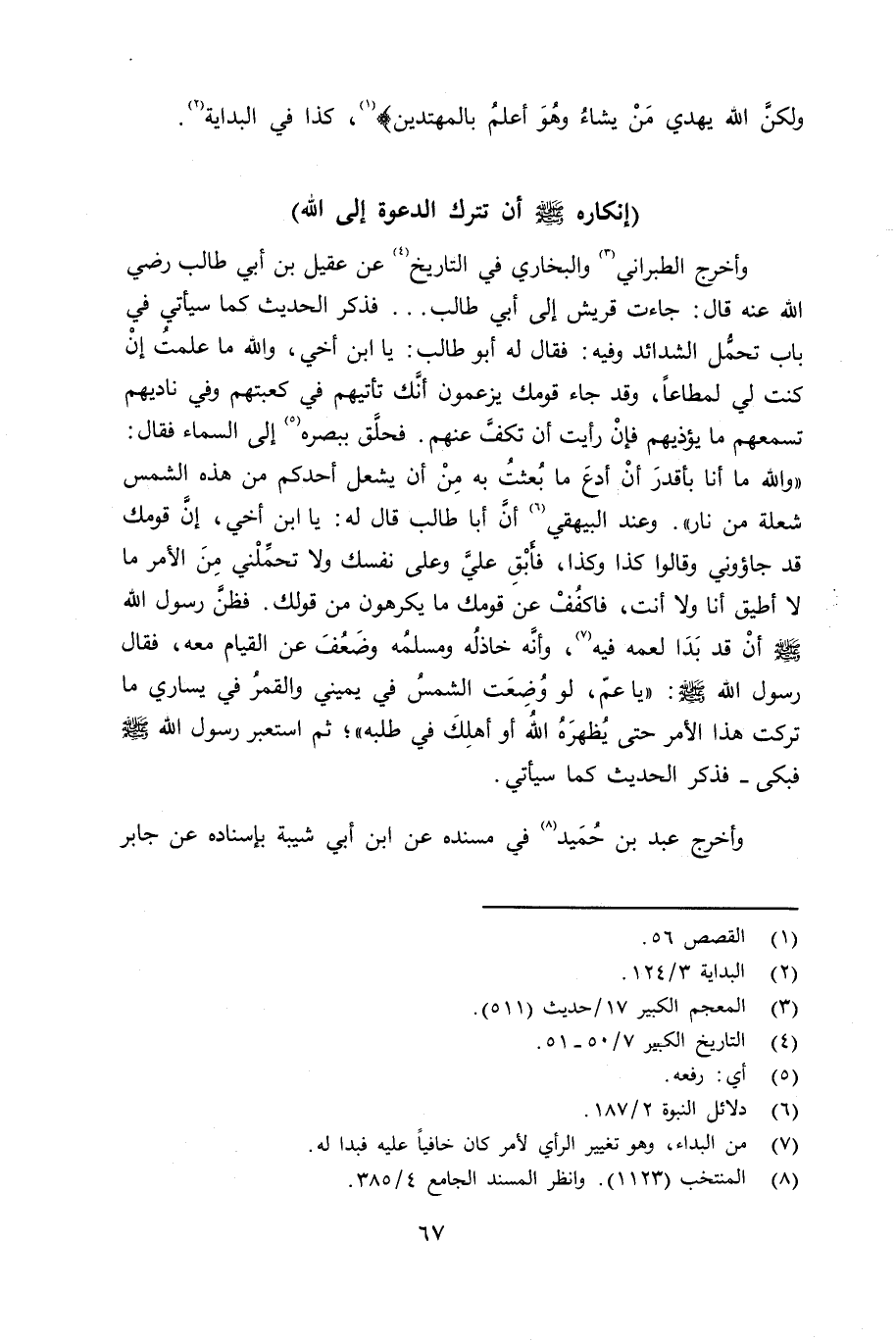 وأخرج الطبراني والبخاري في التاريخ عن عقيل بن أبي طالب رضي الله عنه قال: جاءت قريش إلى أبي طالب ... فذكر الحديث كما سيأتي في باب تحمُّل الشدائد وفيه: فقال له أبو طالب: يا ابن أخي، والله ما علمتُ إِنْ كنت لي لمطاعاً، وقد جاء قومك يزعمون أنَّك تأتيهم في كعبتهم وفي ناديهم تسمعهم ما يؤذيهم فإنْ رأيت أن تكفَّ عنهم. فحلَّق ببصره إلى السماء فقال: «والله ما أنا بأقدرَ أنْ أدَع بعثتُ به مِنْ أن يشعل أحدكم من هذه الشمس شعلة من نار» . وعند البيهقي أنَّ أبا طالب قال له صلى الله عليه وسلم يا ابن أخي، إِنَّ قومك قد جاؤوني وقالوا كذا وكذا، فأَبْقِ عليَّ وعلى نفسك ولا تحمِّلْني مِنَ الأمر ما لا أطيق أنا ولا أنت، فاكففْ عن قومك ما يكرهون من قولك، فظنَّ رسول الله صلى الله عليه وسلم أنْ قد بَدَا لعمه فيه، وأنَّه خاذلُه ومسلمُه وضَعفُ عن القيام معه، فقال رسول الله صلى الله عليه وسلم «يا عمّ، لو وُضعت الشمسُ عن يميني والقمرُ في يساري ما تركت هذا الأمر حتى يُظهرَهُ الله أو أهلِكَ في طلبه» ؛ ثم استعبر رسول الله صلى الله عليه وسلم فبكى - فذكر الحديث كما سيأتي.