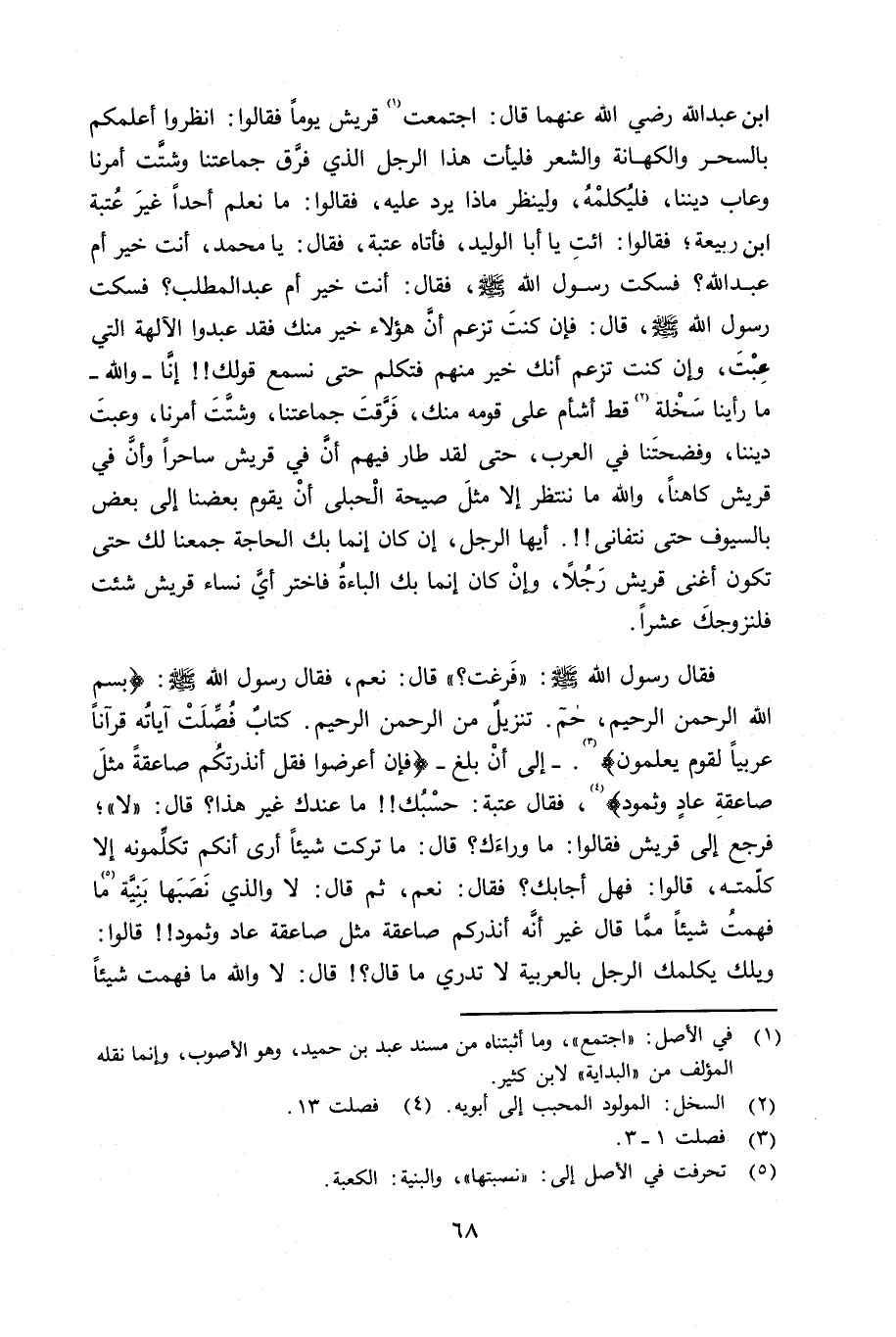 فقال رسول الله صلى الله عليه وسلم «فَرغت؟» نعم، فقال رسول الله صلى الله عليه وسلم «بسم الله الرحمن الرحيم، حم. تنزيلٌ من الرحمن الرحيم. كتابٌ فُصِّلَتْ آياتُه قرآناً عربياً لقوم يعلمون. - إلى أنْ بلغ - فإن أعرضوا فقل أنذرتكُم صاعقةَ مثلَ صاعقةِ عادٍ وثمود» ، فقال عتبة: حسْبُك ما عندك غير هذا؟ قال: «لا» ؛ فرجع إلى قريش فقالوا: ما وراءَك؟ قال: ما تركت شيئاً أرى أنكم تكلِّمونه إلا كلّمته، قالوا: فهل أجابك؟ فقال: نعم، ثم قال: لا والذي نَصَبَها بَنِيَّة ما فهمتُ شيئاً ممَّا قال غير أنَّه أنذركم صاعقة مثل صاعقة عاد وثمود قالوا: ويلك يكلمك الرجل بالعربية لا تدري ما قال؟ قال: لا والله ما فهمت شيئاً