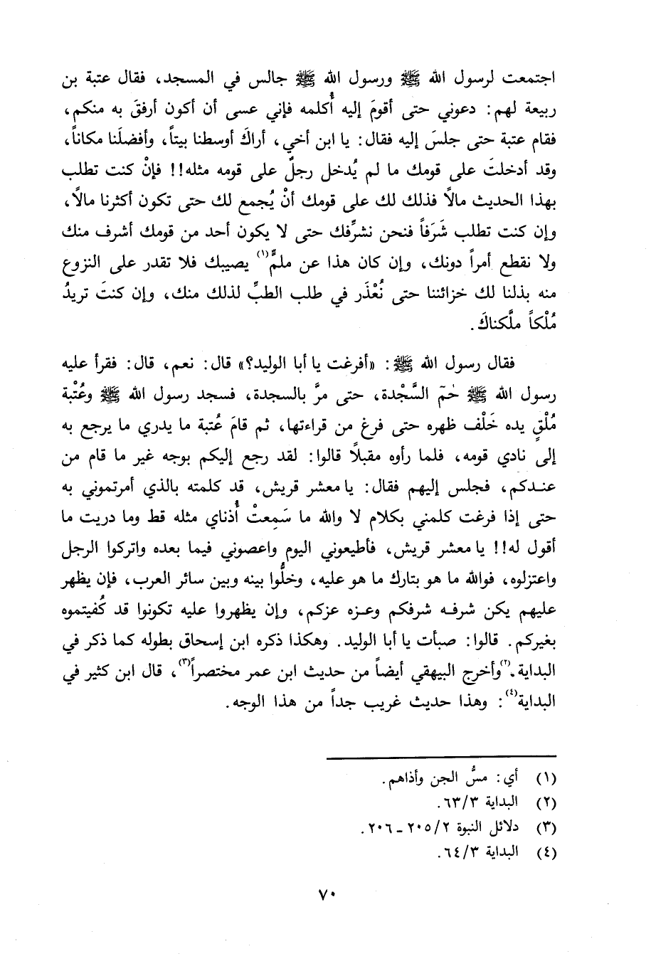 فقال رسول الله صلى الله عليه وسلم «أَفرغت يا أبا الوليد؟» قال: نعم. قال: فقرأ عليه رسول الله صلى الله عليه وسلم حم السَّجْدة، حتى مرَّ بالسجدة، فسجد رسول الله صلى الله عليه وسلم وعتبة مُلْقٍ يده خَلْف ظهره حتى فرغ من قراءتها، ثم قام عتبة ما يدري ما يرجع به إلى نادي قومه، فلما رأوه مقبلاً قالوا: لقد رجع إليكم بوجه غير ما قام من عندكم، فجلس إليهم فقال: يا معشر قريش، قد كلمته بالذي أمرتموني به حتى إذ فرغت كلمني بكلام لا والله ما سمعت أذناي مثله قط وما دريت ما أقول له يا معشر قريش، فأطيعوني اليوم واعصوني فيما بعده واتركوا الرجل واعتزلوه، فوالله ما هو بتارك ما هو عليه، وخلُّوا بينه وبين سائر العرب، فإن يظهر عليكم يكن شرفه شرفكم وعزه عزكم، وإن يظهروا عليه تكونوا قد كُفيتموه بغيركم. قالوا: صبأت يا أبا الوليد. وهكذا ذكره ابن إسحاق بطوله كما ذكر في البداية، وأخرجه البيهقي أيضاً من حديث عمر مختصراً، قال ابن كثير في البداية: وهذا حديث غريب جداً من هذا الوجه.