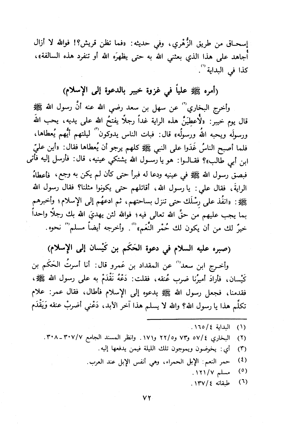 وأخرج البخاري عن سهل بن سعد رضي الله عنه أنَّ رسول الله صلى الله عليه وسلم قال يوم خيبر: «لأُعطِيَنَّ هذه الراية غداً رجلاً يفتح الله على يديه، يحب الله ورسولَه ويحبه الله ورسولُه» قال: فبات الناس يدوكون ليلتهم أيُّهم يُعطاها، فلما أصبح الناس غَدَوا على النبي صلى الله عليه وسلم كلهم يرجو أن يُعطاها، فقال: «أين عليّ بن أبي طالب؟» فقالوا: هو يا رسول الله يشتكي عينيه، قال: فأرسل إليه فأتى فبصق رسول الله صلى الله عليه وسلم في عينيه ودعا له فبرأ حتى كأن لم يكن به وجع، فأعطاه الراية، فقال علي: يا رسول الله، أقاتلهم حتى يكونوا مثلنا، فقال رسول الله صلى الله عليه وسلم «أنفُذ على رِسْلَك حتى تنزل بساحتهم، ثم أدعهُم إِلى الإسلام؛ وأخبرهم بما يجب عليهم من حقِّ الله تعالى فيه؛ فوالله لئن يهديَ الله بك رجلاً واحداً خير لك من أن يكون لك حُمْر النَّعَم» . وأخرجه أيضاً مسلم نحوه.