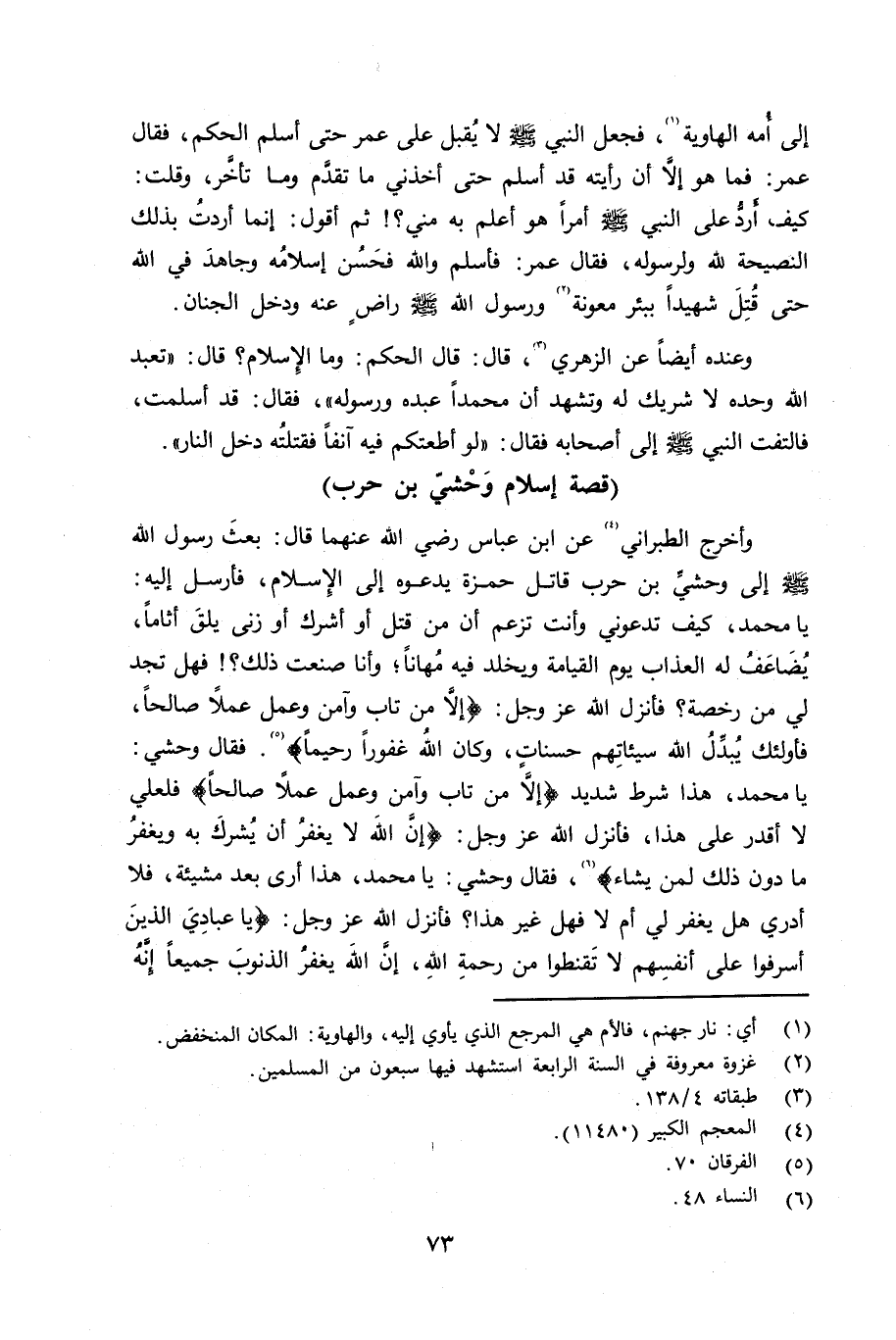 وأخرج الطبراني عن ابن عباس رضي الله عنهما قال: بعث رسول الله صلى الله عليه وسلم إِليّ وحشيِّ بن حرب قاتل حمزة يدعوه إلى الإِسلام، فأرسل إليه؛ يا محمد، كيف تدعوني وأنت عزعم أن من قتل أو أشرك أو زنى يلقَ أثاماً، يضاعف له العذاب يوم القيامة ويخلد فيه مُهاناً؛ وأنا صنعت ذلك؟ فهل تجد لي من رخصة؟ فأنزل الله عزّ وجلّ: {إِلاَّ مَن تَابَ وَءامَنَ وَعَمِلَ عَمَلاً صَالِحاً فَأُوْلَئِكَ يُبَدّلُ اللَّهُ سَيّئَاتِهِمْ حَسَنَاتٍ وَكَانَ اللَّهُ غَفُوراً رَّحِيماً} (الفرقان: 70) . فقال وحشي: يا محمد، هذا شرط شديد «إلا من تاب وآمن عمل عملاً صالحاً» فلعلِّي لا أقدر على هذا، فأنزل الله عزّ وجلّ: {إِنَّ اللَّهَ لاَ يَغْفِرُ أَن يُشْرَكَ بِهِ وَيَغْفِرُ مَا دُونَ ذَلِكَ لِمَن يَشَآء وَمَن يُشْرِكْ بِاللَّهِ فَقَدِ افْتَرَى إِثْماً عَظِيماً} (النساء: 48) ، فقال وحشي: يا محمد، هذا أرى بعد مشيئة، فلا أدري هل يغفر لي أم لا فهل غير هذا؟ فأنزل الله عزّ وجلّ: {قُلْ ياعِبَادِىَ الَّذِينَ أَسْرَفُواْ عَلَى أَنفُسِهِمْ لاَ تَقْنَطُواْ مِن رَّحْمَةِ اللَّهِ إِنَّ اللَّهَ يَغْفِرُ الذُّنُوبَ جَمِيعاً إِنَّهُ