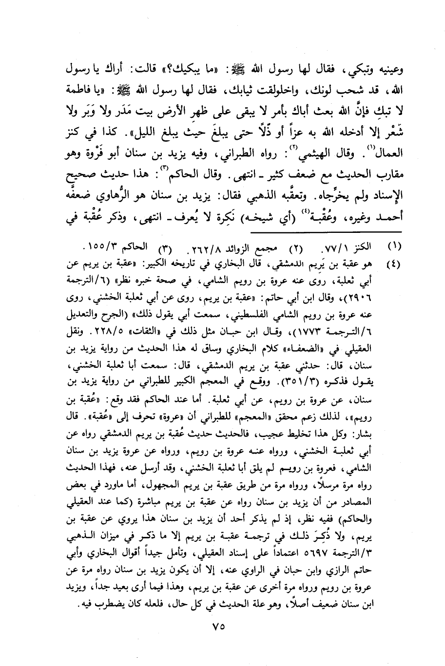 وعينيه وتبكي، فقال لها رسول الله صلى الله عليه وسلم «ما يبكيك؟» قالت: أراك يا رسول الله، قد شحب لونك، واخلولقت ثيابك، فقال لها رسول الله صلى الله عليه وسلم «يا فاطمة لا تبك فإنَّ الله بعث أباك بأمر لا يبقى على ظهر الأرض بيت مَدَر ولا وبر ولا شَعَر إلا أدخله الله به عزاً أو ذلاً حتى يبلغَ حيث يبلغ الليل» كذا في كنز العمال. وقال الهيثمي: رواه الطبراني، وفيه يزيد بن سِنان أبو فَرْوة وهو مقارب الحديث مع ضعف كثير - إنتهى، وقال الحاكم: هذا حدث صحيح الإسناد ولم يخرِّجاه، وتعقبه الذهبي فقال: يزيد بن سنان هو الرّهاوي ضعفَّه أحمد وغيره، وعُقْبة (أي شيخه) نَكِرة لا تعرف - إنتهى، وذكر عُقْبة في