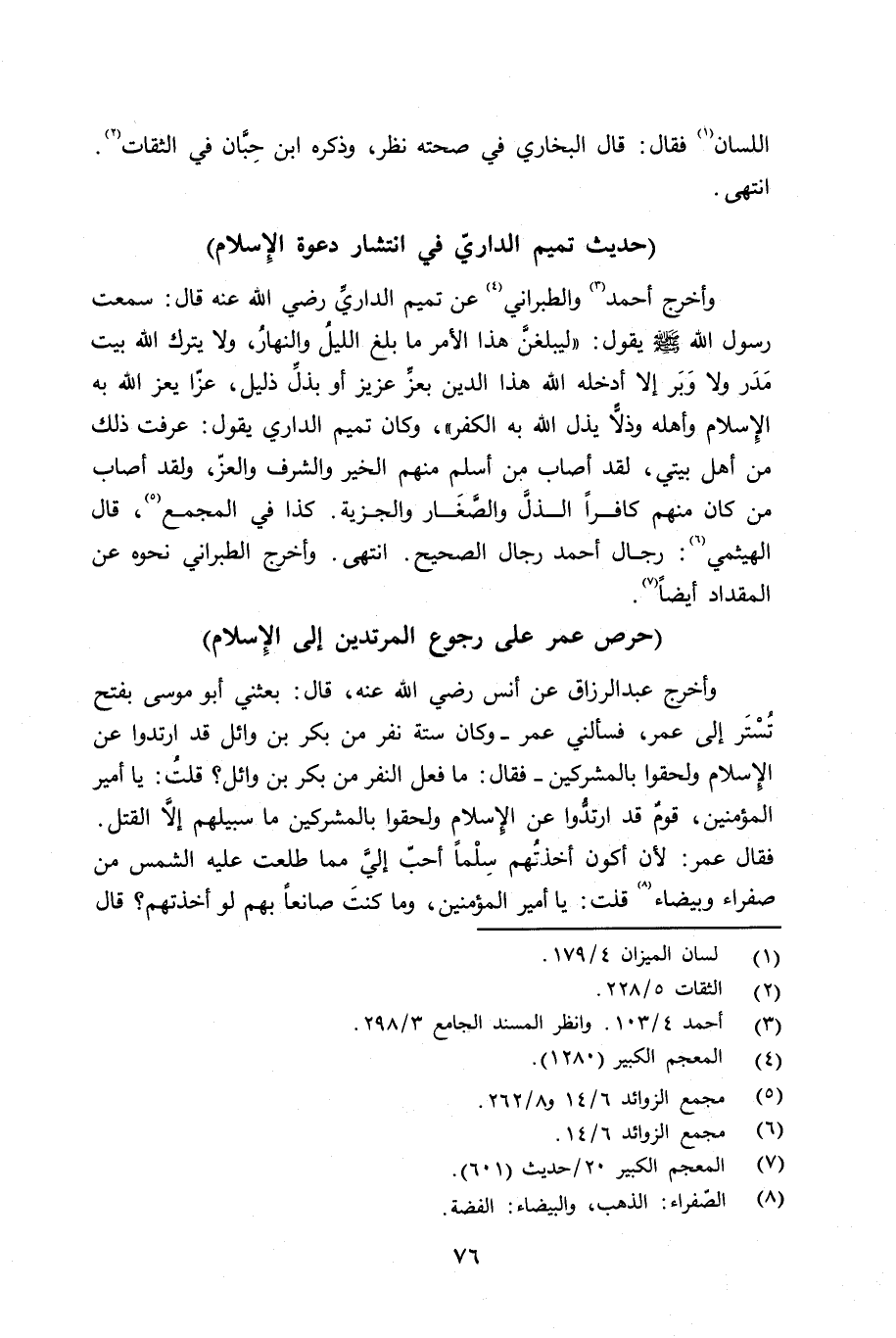 وأخرج أحمد والطبراني عن تميم الداريِّ رضي الله عنه قال: سمعت رسول الله صلى الله عليه وسلم يقول: «ليبلغنَّ هذا الأمر ما بلغ الليلُ والنهارُ، ولا يترك الله بيت مَدَر ولا وَبَر إِلا أدخله الله هذا الدين بعزِّ عزيز أو بذلِّ ذليل، غزّاً يعز الله به الإِسلام وأهله وذلا يذل الله به الكفر» ، وكان تميم الداري يقول: عرفت ذلك من أهل بيتي، لقد أصاب من أسلم منهم الخير والشرف والعزّ، ولقد أصاب من كان منهم كافراً الذلَّ والصَّغَار والجزية. كذا في المجمع و. قال الهيثمي: رجال أحمد رجال الصحيح. إنتهى. وأخرح الطبراني نحوه عن المقداد أيضاً.