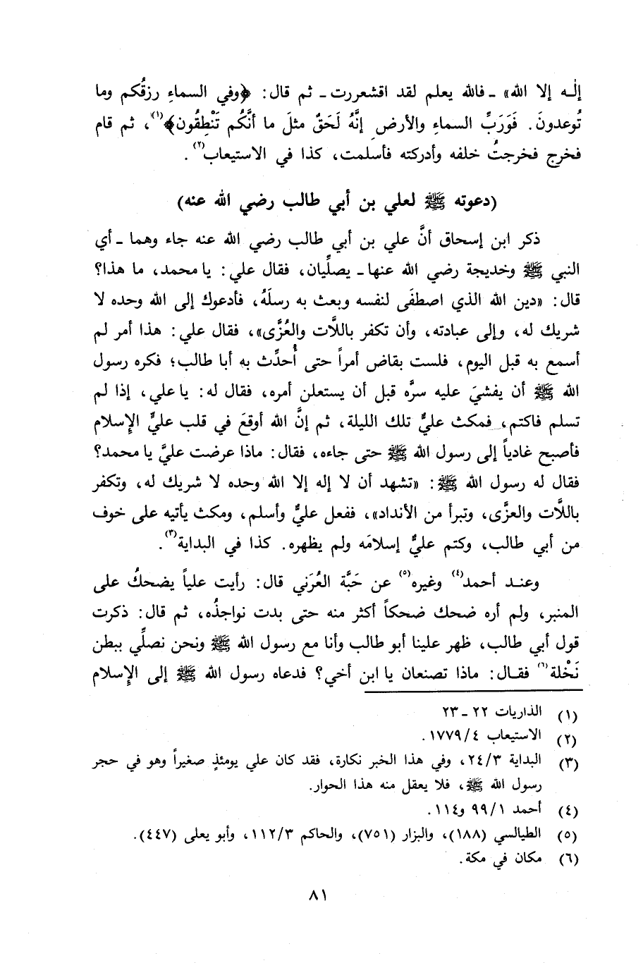 ذكر ابن إسحاق أنَّ علي بن أبي طالب رضي الله عنه جاء وهما - أي النبي صلى الله عليه وسلم وخديجة رضي الله عنها - يصلِّين، فقل علي: يا محمد، ما هذا؟ قال: «دين الله الذي اصطفَى لنفسه وبعث به رسله، فأدعوك إلى الله وحده لا شريك له، وإلى عبادته، وأن تكفر اللات والعُزَّى» ، فقال علي: هذا أمر لم أسمع به قبل اليوم، فلست بقاض أمراً حتى أُحدِّث به أبا طالب؛ فكره رسول الله صلى الله عليه وسلم أن يفشيَ عليه سرَّه قبل أن يستعلن أمره، فقال له: يا علي، إذ لم تسلم فاكتم، فمكث عليٌّ تلك الليلة، ثم إنَّ الله أوقع في قلب عليَ الإِسلام فأصبح غادياً إلى رسول الله حتى جاءه، فقال: ماذا عرضت عليَّ يا محمد؟ فقال له رسول الله صلى الله عليه وسلم «تشهد أن لا إله إلا الله وحده لا شريك له، وتكفر باللات والعزَّى، وتبرأ من الأنداد» ، ففعل عليٌّ وأسلم، ومكث يأتيه على خوف من أبي طالب، وكتم عليٌّ إسلامَه ولم يظهره، كذا في البداية.