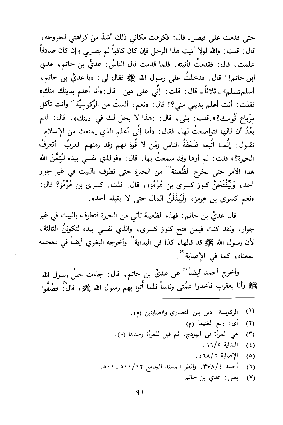 وأخرج أحمد أيضاً عن عديِّ بن حاتم، قال: جاءت خيل رسول الله صلى الله عليه وسلم وأنا بعقرب فأخذوا عمَّتي وناساً فلما أتَوا بهم رسول الله صلى الله عليه وسلم قال: فصُفُّوا