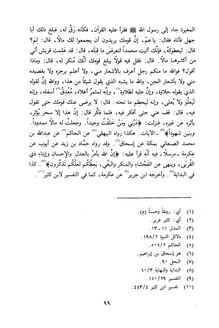 المغيرة جاء إلى رسول الله صلى الله عليه وسلم فقرأ عليه القرآن، فكأنه رَقَّ له، فبلغ ذلك أبا جهل فأتاه فقال: يا عمّ، إنَّ قومك يريدون أن يجمعوا لك مالاً، قال: لِمَ؟ قال: ليعطوكَهُ، فإنَّك أتيت محمداً لتعرِضَ ما قِبَلَه، قال: قد عَلِمت قريش أني من أكثرها مالاً. قال: فقل فيه قولاً يبلغ قومك أنَّك مُنكر له، قال: وماذا أقول؟ فوالله ما منكم رجل أعرف بالأشعار مني، ولا أعلم برجزه لا بقصيده من لا بأشعار الجن، والله ما يشبه الذي يقول شيئاً من هذا، ووالله إنَّ لقوله الذي يقول حلاوة، وإنَّ عليه لطلاوة، وإنَّه لمثمرٌ أعلاه، مُغْدِقٌ أسفله، وإنه لَيَعلُو ولا يُعلى، وإنه ليحطِم ما تحته. قال: لا رضى عنك قومك حتى تقول فيه، قال: قف عني حتى أفكر فيه، فلما فكَّر قال: إنْ هذا إلا سحر يُؤثر، يأثره عن غيره، فنزلت: «ذَرْني ومَنْ خَلَقْتُ وحيداً. وجعلتُ له مالاً ممدوداً. وبنين شهوداً» - الآيات. هكذا رواه البيهقي عن الحاكم عن عبد الله بن محمد الصنعاني بمكة عن إسحاق. وقد رواه حمَّاد بن زيد عن أيوب عن عِكرمة - مرسلاً - فيه أنّه قرأ عليه: «إنَّ الله يأمرُ بالعدلِ والإِحسانِ وإيتاءِ ذي القُربَى، وينهى عن الفَحْشاءِ والمنكرِ والبَغْي، يَعِظُكُم لعلَّكُم تَذكَّرون» . كذا في البداية. وأخرجه ابن جرير عن عكرمة كما في التفسير لابن كثير.