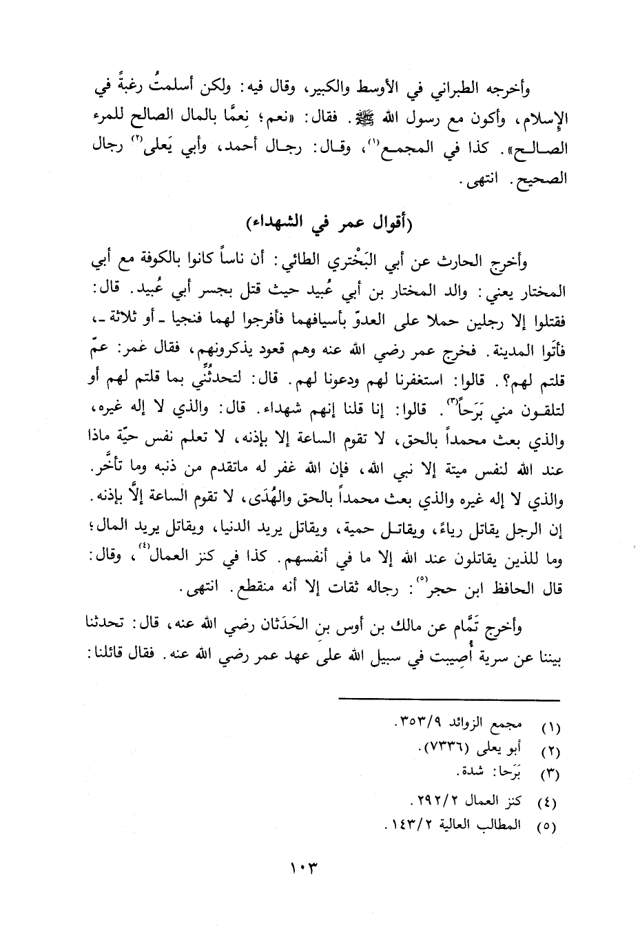 وأخرج الحارث عن أبي البَخْتري الطائي: أن ناساً كانوا بالكوفة مع أبي المختار يعني: والد المختار بن أبي عُبيد حيث قتل بحسر أبي عُبيد. قال: فقتلوا إِلا رجلين حملا على العدوّ بأسيافهما فأفرجوا لهما فنجيا - أو ثلاثة -، فأتَوا المدينة. فخرج عمر رضي الله عنه وهم قعود يذكرونهم، فقال عمر: عمّ قلتم لهم؟. قالوا: إستغفرنا لهم ودعونا لهم. قال: لتحدثُنِّي بما قلتم لهم أو لتلقون مني بَرْحاً. قالوا: إِنا قلنا إِنهم شهداء. قالوا: والذي لا إله غيره، والذي بعث محمداً بالحق، لا تقوم الساعة إلا بإذنه، لا تعلم نفس حيّة ماذا عند الله لنفس ميتة إلا نبي الله، فإن الله غفر له ما تقدم من ذنبه وما تأخَّر. والذي لا إله غيره والذي بعث محمداً بالحق والهدى، لا تقوم الساعة إلا بإذنه. إن الرجل يقاتل رياءً، ويقاتل حمية، ويقاتل يريد الدنيا، ويقاتل يريد المال؛ وما للذين يقاتلون عند الله إلا ما في أنفسهم. كذا في كنز العمال، وقال: قال الحافظ ابن حجر: رجاله ثقات إلا أنه منقطع. انتهى.