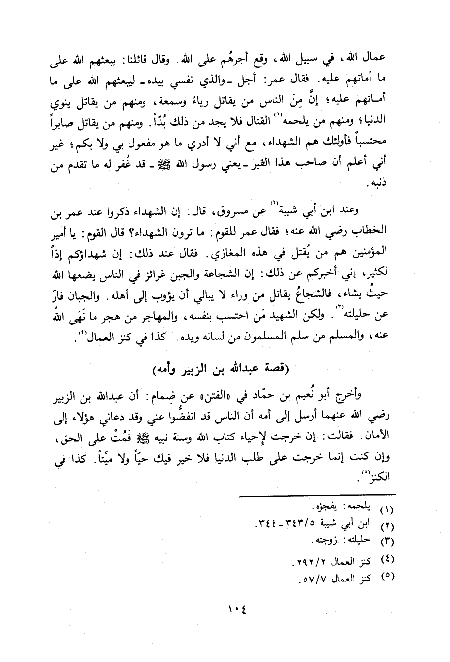 وعند ابن شيبة عن مسروق قال: إِن الشهداء ذكروا عند عمر بن الخطاب رضي الله عنه؛ فقال عمر للقوم: ما ترون الشهداء؟ قال: القوم: يا أمير المؤمنين هم من يقتل في هذه المغازي. فقال عند ذلك: إن شهداؤكم إذاً لكثير، إني أخبركم عن ذلك: إن الشجاعة والجبن غرائز في الناس يضعها الله حيث يشاء، فالشجاع يقاتل من وراء لا يبالي أن يؤوب إلى أهله. والجبان فارّ عن حليلته، ولكن الشهيد من احتسب بنفسه، والمهاجر من هجر ما نهى الله عنه، والمسلم من سلم المسلمون من لسانه ويده. كذا في كنز العمال.