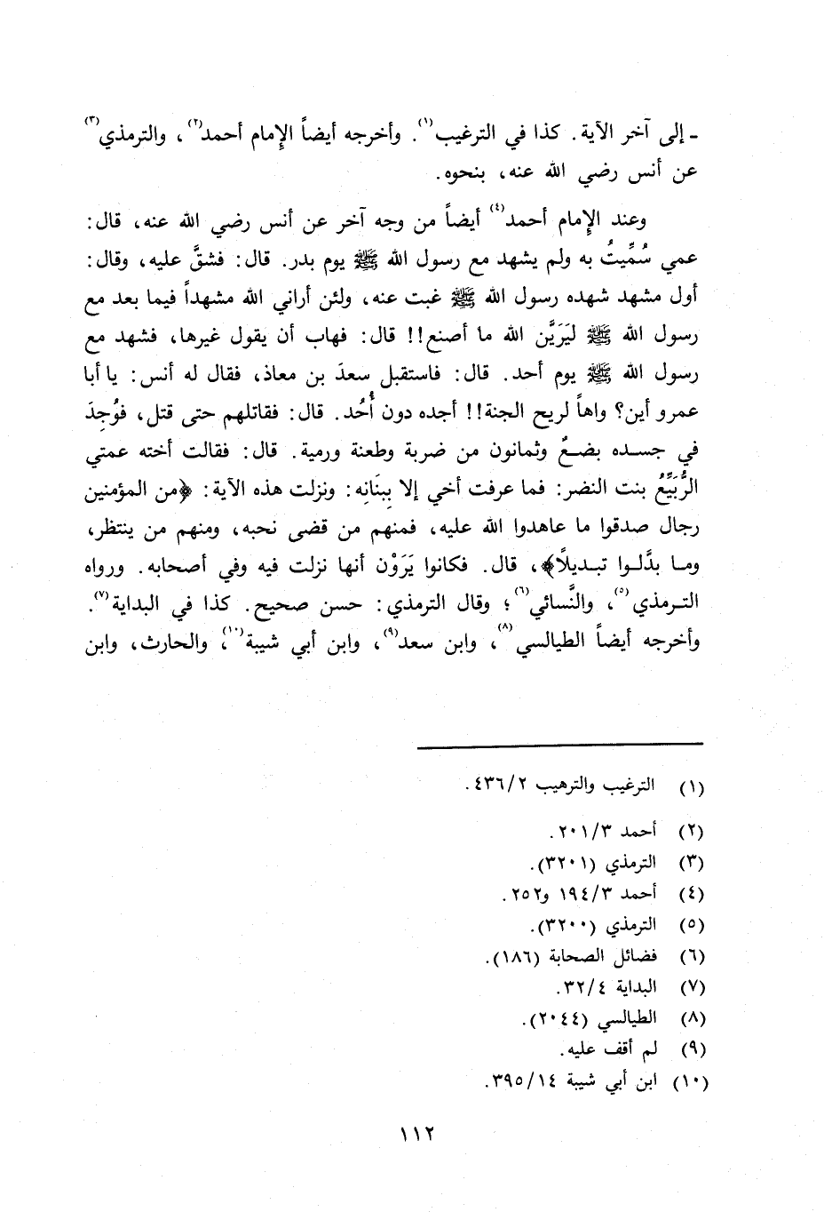 وعند الإِمام أحمد أيضاً من وجه آخر عن أنس رضي الله عنه قال: عمي سُمِّيتُ به ولم يشهد مع رسول الله صلى الله عليه وسلم يوم بدر. قال: فشقِّ عليه، وقال: أول مشهد شهده رسول الله صلى الله عليه وسلم غبت عنه، ولئن أراني الله مشهداً فيما بعد مع رسول الله صلى الله عليه وسلم ليَرَينَّ الله ما أصنع قال: فهاب أن يقول غيرها، فشهد مع رسول الله صلى الله عليه وسلم يوم أُحد. قال: فاستقبل سعدَ بن معاذ، فقال له أنس: يا أبا عمرو أين؟ واهاً لريح الجنة أجده دون أحد. قال: فقاتلهم حتى قتل، فوجد في جسده بضع وثمانون من ضربة وطعنة ورمية. قال فقالت أخته: عمتي الرُّبَيِّعُ بنت النضر: فما عرفت أخي إلا ببنانه: ونزلت هذه الآية: {مّنَ الْمُؤْمِنِينَ رِجَالٌ صَدَقُواْ مَا عَاهَدُواْ اللَّهَ عَلَيْهِ فَمِنْهُمْ مَّن قَضَى نَحْبَهُ وَمِنْهُمْ مَّن يَنتَظِرُ وَمَا بَدَّلُواْ تَبْدِيلاً} ، قال: فكانوا يَرَوْن أنها نزلت فيه وفي أصحابه. ورواه الترمذي، والنِّسائي؛ وقال الترمذي: حسن صحيح. كذا في البداية. وأخرجه أيضاً الطيالسي، وابن سعد، وابن أبي شيبة، والحارث، وابن
