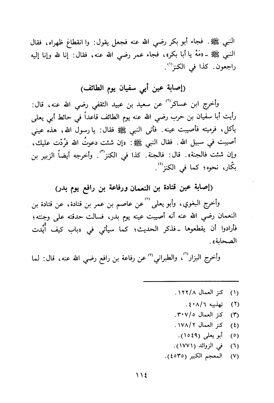 وأخرج ابن عساكر عن سعيد بن عبيد الثقفي رضي الله عنه قال: رأيت أبا سفيان بن حرب رضي الله عنه يوم الطائف قاعداً في حائط أبي يعلى يأكل، فرميته فأصيبت عينه. فأتى النبي صلى الله عليه وسلم فقال: يا رسول الله، هذه عيني أصيبت في سبيل الله. فقال النبي صلى الله عليه وسلم «إن شئت دعوتُ الله فرُدّت عليك، وإن شئت فالجنة» . قال: فالجنة. كذا في الكنز. وأخرجه أيضاً الزبير بن بكّار - نحوه؛ كما في الكنز.