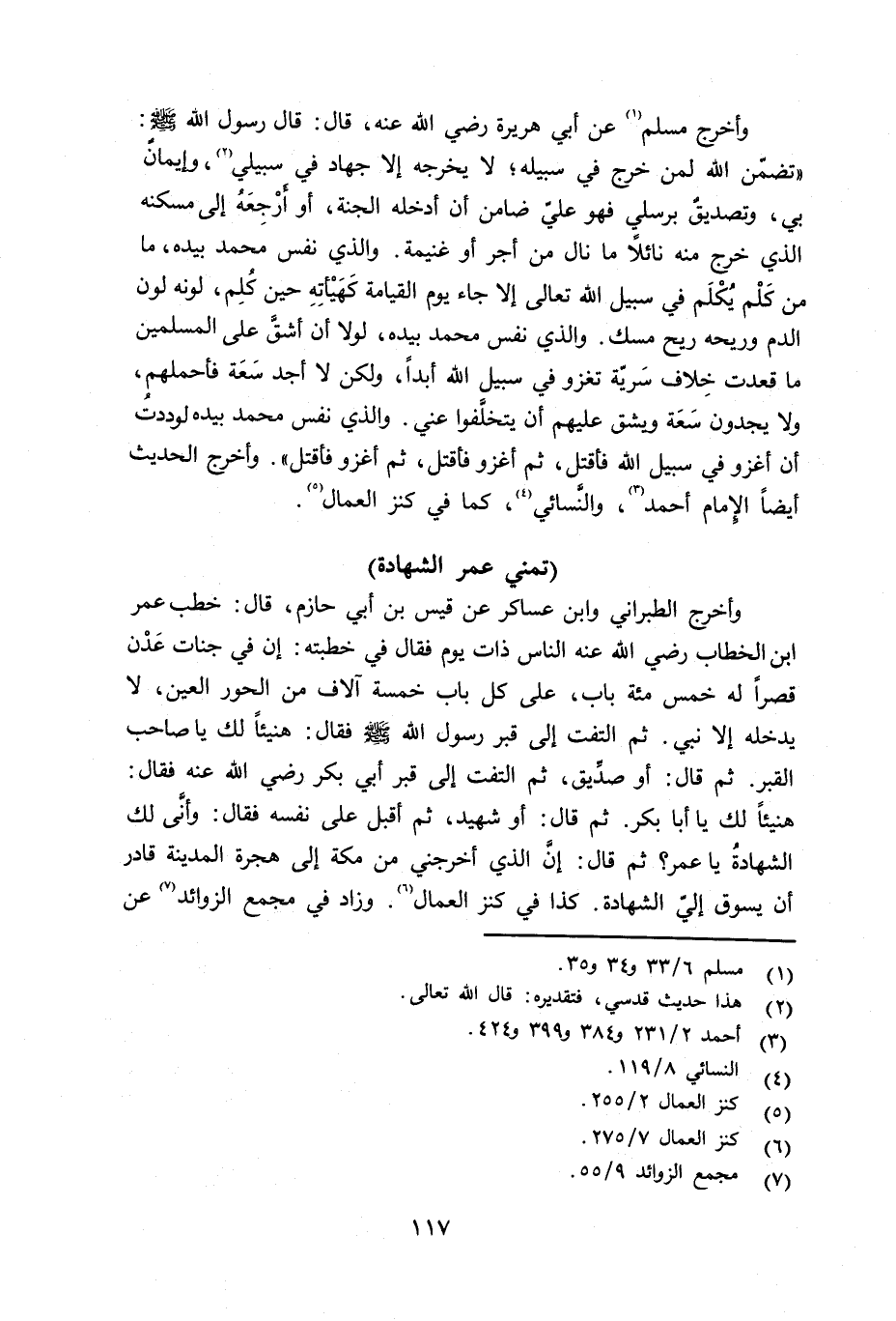 وأخرج مسلم عن أبي هريرة رضي الله عنه قال: قال رسول الله صلى الله عليه وسلم «تضمّن الله لمن خرج في سبيله؛ لا يخرجه إلا جهاد في سبيلي، وإيمانٌ بي، وتصديقٌ برسلي، فهو عليّ ضامن أن أدخله الجنة، أو أَرْجِعَهُ إلى مسكنه الذي خرج منه نائلاً ما نال من أجر أو غنيمة. والذي نفس محمد بيده، ما نكَلْم يُكْلَم في سبيل الله تعالى إلا جاء يوم القيامة كَهَيْأتِهِ ين كُلِم، لونه لون الدم وريحه ريح مسك. والذي نفس محمد بيده، لولا أن أشقَّ على المسلمين ما قعدت خِلاف سَريّة تغزو في سبيل الله أبداً، ولكن لا أجد سعة فأحملهم، ولا يجدون سَعَة ويشق عليهم أن يتخلفوا عني. والذي نفس محمد بيده لوددتُ أن أغزو في سبيل الله فأقتل، ثم أغزو فأقتل، ثم أغزو فأقتل» . وأخرج الحديث أيضاً الإِمام أحمد، والنِّسائي، كما في كنز العمال.