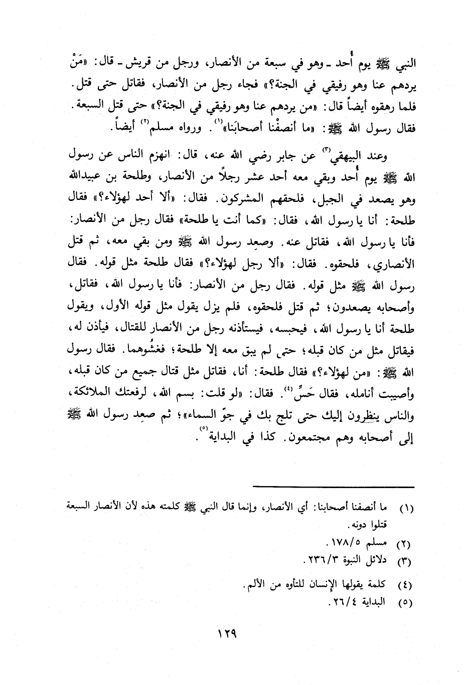 النبي صلى الله عليه وسلم يوم أُحد - وهو في سبعة من الأنصار، ورجل من قريش - قال: «مَنْ يردهم عنا وهو رفيقي في الجنة؟» فجاء رجل من الأنصار، فقاتل حتى قتل. فلما رهقوه أيضاً قال: «من يردهم عنا وهو رفيقي في الجنة؟» حتى قتل السبعة. فقال رسول الله صلى الله عليه وسلم «ما أنصفْنا أصحابَنا» . ورواه مسلم أيضاً.