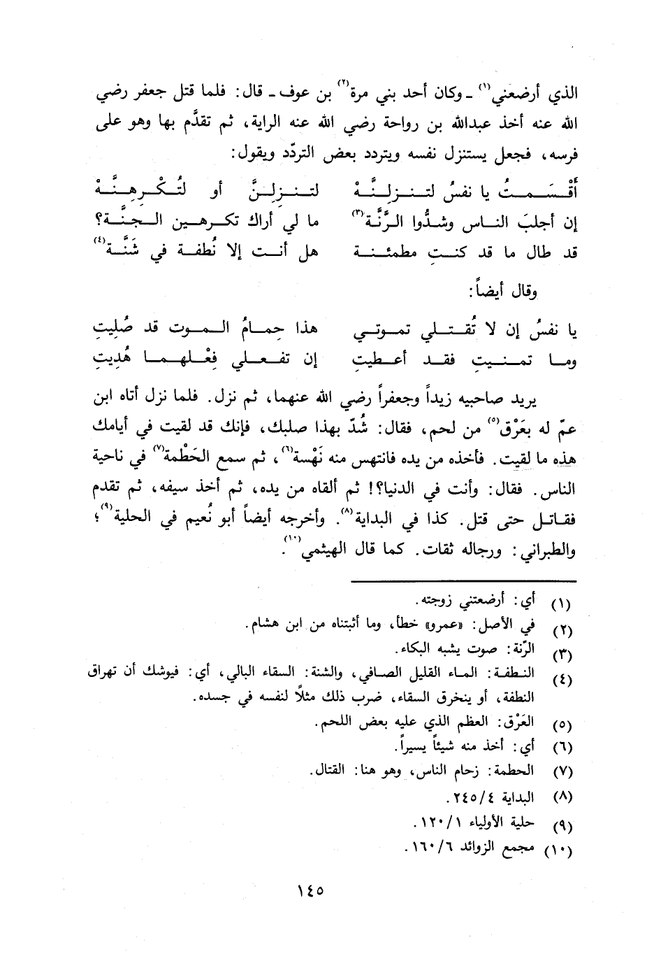 الذي أرضعني - وكان أحد بني مرة بن عوف - قال: فلما قتل جعفر رضي الله عنه أخذ عبد الله بن رواحة رضي الله عنه الراية، ثم تقدَّم بها وهو على فرسه، فجعل يستنزل نفسه ويتردد بعض التردّد ويقول: