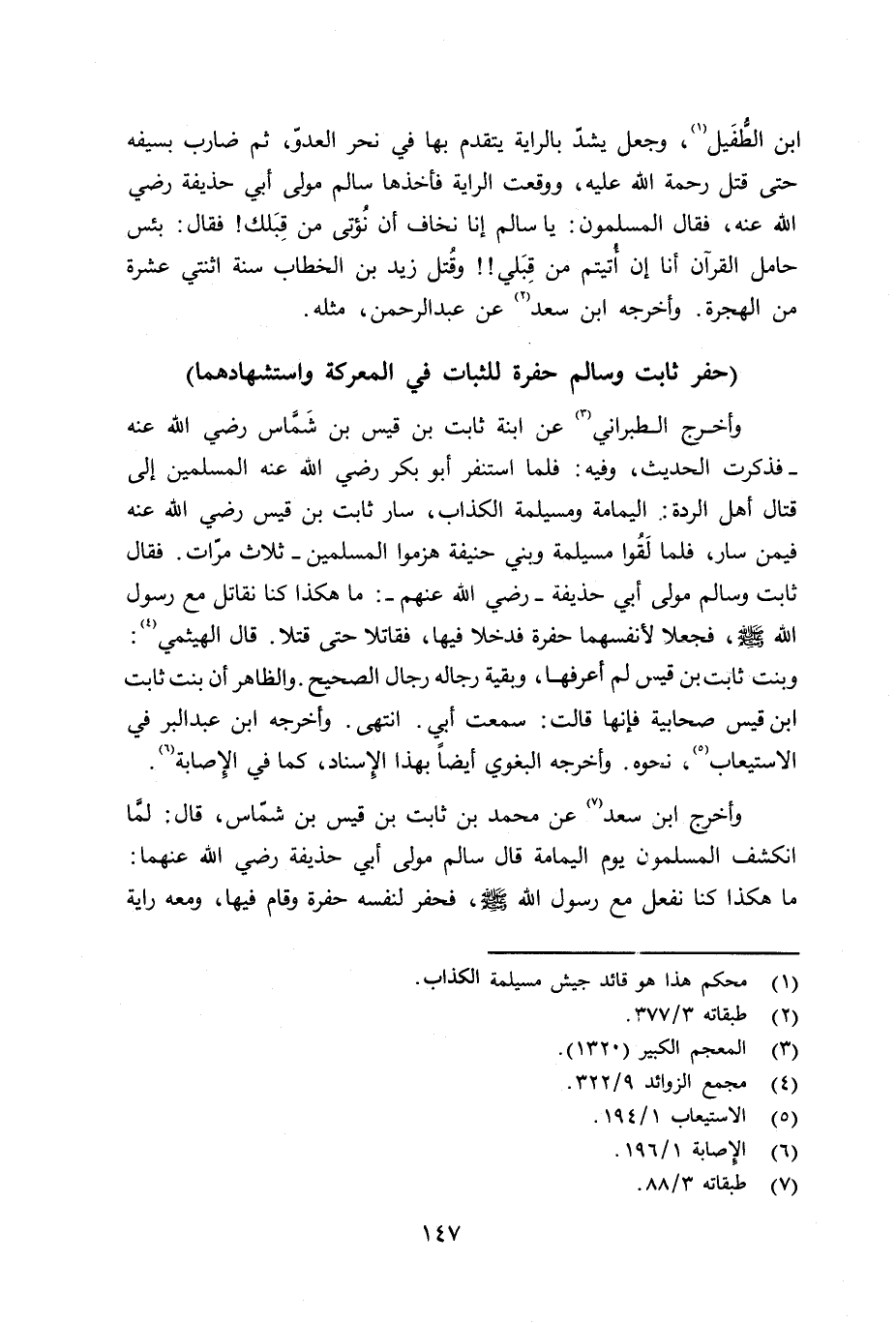 وأخرج ابن سعد عن محمد بن ثابت بن قيس بن شمّاس رضي الله عنه قال: لمَّ انكشف المسلمون يوم اليمامة قال سالم مولى أبي حذيفة رضي الله عنهما: ما هكذا كنا نفعل مع رسول الله صلى الله عليه وسلم فحفر لنفسه حفرة وقام فيها، ومعه راية