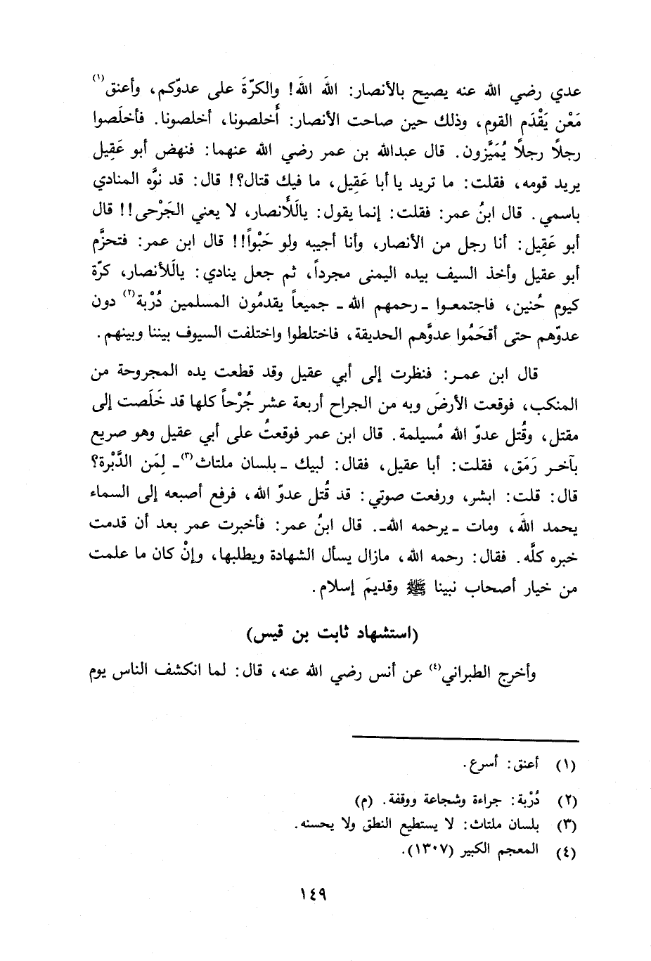 عدي رضي الله عنه يصيح بالأنصار: الله الله والكرّةَ على عدوّكم، وأعنق مَعْن يَقْدَم القوم، وذلك حني صاحت الأنصار: أَخلصونا، أخلصونا، فأخلَصوا رجلاً رجلاً يُمَيَّزون. قال عبد الله بن عمر رضي الله عنهما: فنهض أبو عَقيل يريد قومه، فقلت: ما تريد يا أبا عَقِيل، ما فيك قتال؟ قال: قد نوَّه المنادي باسمي. قال ابن عمر: فقلت؛ إنما يقول: يا للأَنصار، لا يعني الجَرْحى قال أبو عَقِيل: أنا رجل من الأنصار، وأنا أجيبه ولو حَبْواً قال ابن عمر: فتحزمَّ أبو عقيل وأخذ السيف بيده اليمنى مجرداً، ثم جعل ينادي: يا للأنصار، كرّة كيوم حُنَين، فاجتمعوا - رحمهم الله - جميعاً يقدمُون المسلمين دُرْبة دون عدوْهم حتى أقحموا عدوَّهم الحديفة، فاختلطوا واختلفت السيوف بيننا وبينهم.