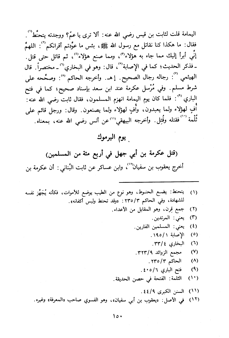 اليمامة قلت لثابت بن قيس رضي الله عنه: ألا ترى يا عمّ؟ ووجدته يتحنَّط. فقال: ما هكذا كنا نقاتل مع رسول الله صلى الله عليه وسلم بئس ما عوَّدتم أقرانكم: اللهمَّ إِنِّي أبرأ إِليك مما جاء به هؤلاء، ومما صنع هؤلاء، ثم قاتل حتى قتل. - فذكر الحديث؛ كما في الإِصابة، قال: وهو في البخاري - مختصراً. قال الهيثمي: رجاله رجال الصحيح اهـ. وأخرجه الحاكم: وصحَّحه على شرط مسلم. وفي مرسل عكرمة عن ابن سعد بإسناد صحيح؛ كما في فتح الباري: فلما كان يوم اليمامة إنهزم المسلمون. فقال ثابت رضي الله عنه: أُفٍ لهؤلاء ولما يعبدون، وأُفٍ لهؤلاء ولما يصنعون. وقال: ورجل قائم على ثُلْمة فقتله وقُتِل. وأخرجه البيهقي عن أنس رضي الله عنه - بمعناه.