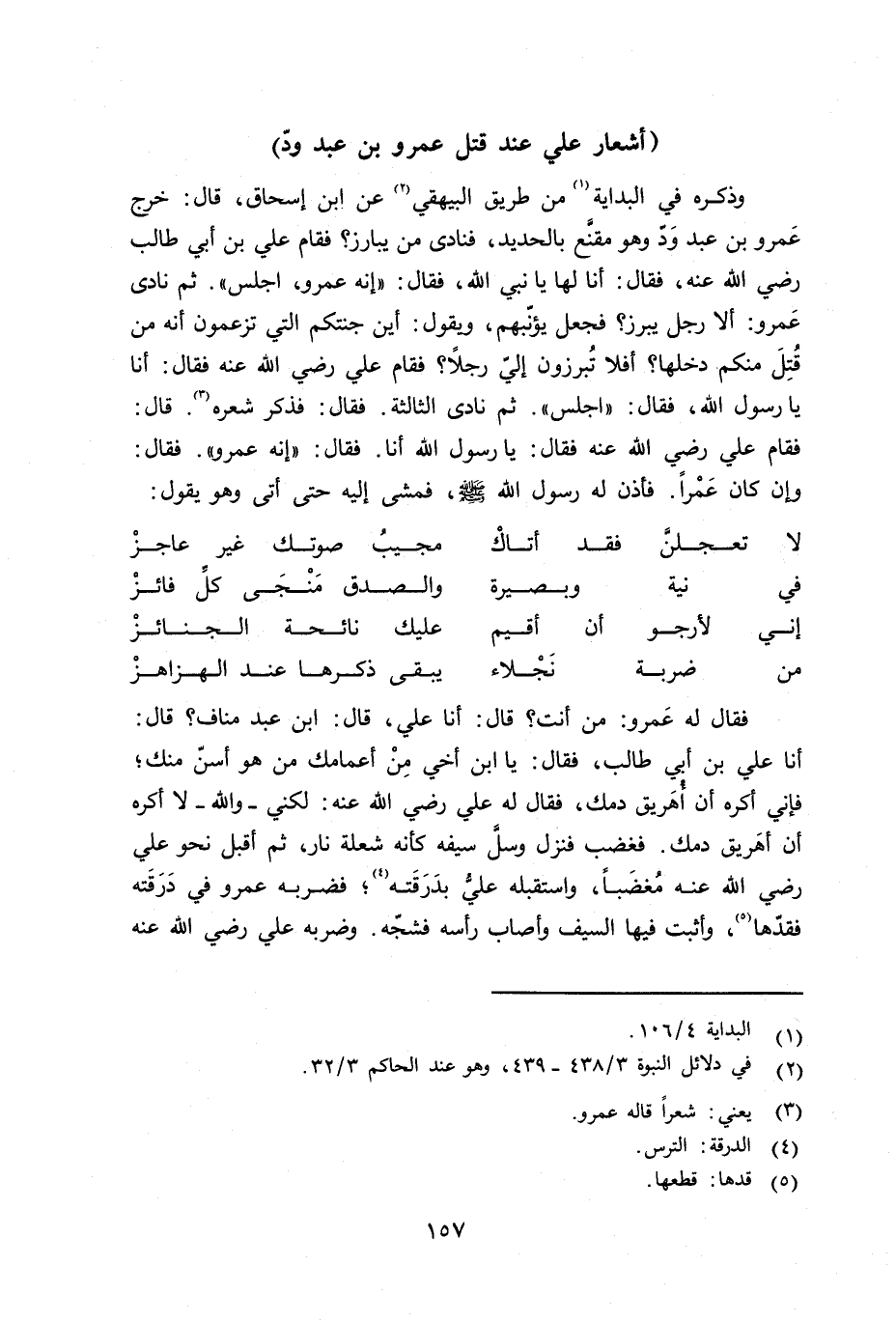 وذكره في البداية من طريق البيهقي عن ابن إسحاق قال: خرج عمرو بن عبد وعدّ وهو مقنَّع بالحديد، فنادى من يبارز؟ فقام علي بن أبي طالب رضي الله عنه، فقال: أنا لها يا نبي الله، فقال: «إنه عمرو، إجلس» . ثم نادى عمرو: ألا رجل يبرز؟ فجعل يؤنّبهم، ويقول: أين جنتكم التي تزعمون أنه من قتل منكم دخلها؟ أفلا تُبرزون إِليّ رجلاً؟ فقام علي رضي الله عنه فقال: أنا يا رسول الله، فقال: «إجلس» . ثم نادى الثالثة. فقال: فذكر شعره. قال: فقام علي رضي الله عنه فقال: يا رسول الله أنا. فقال: «إنه عمرو» . فقال: «وإن كان عَمْراً. فأذن له رسول الله صلى الله عليه وسلم فمشى إليه حتى أتى وهو يقول: