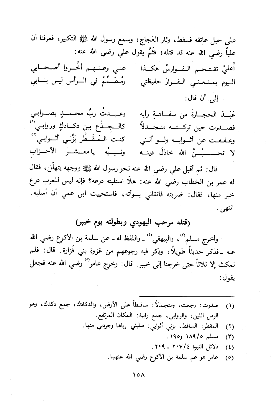 قال: ثم أقبل علي رضي الله عنه نحو رسول الله صلى الله عليه وسلم ووجهه يتهلّل، فقال له عمر بن الخطاب رضي الله عنه: هلا إستلبته درعه؟ فإنه ليس للعرب درع خير منها، فقال: ضربته فأقتاني بسوأته، فاستحييت ابن عمي أن أسلبه. انتهى.