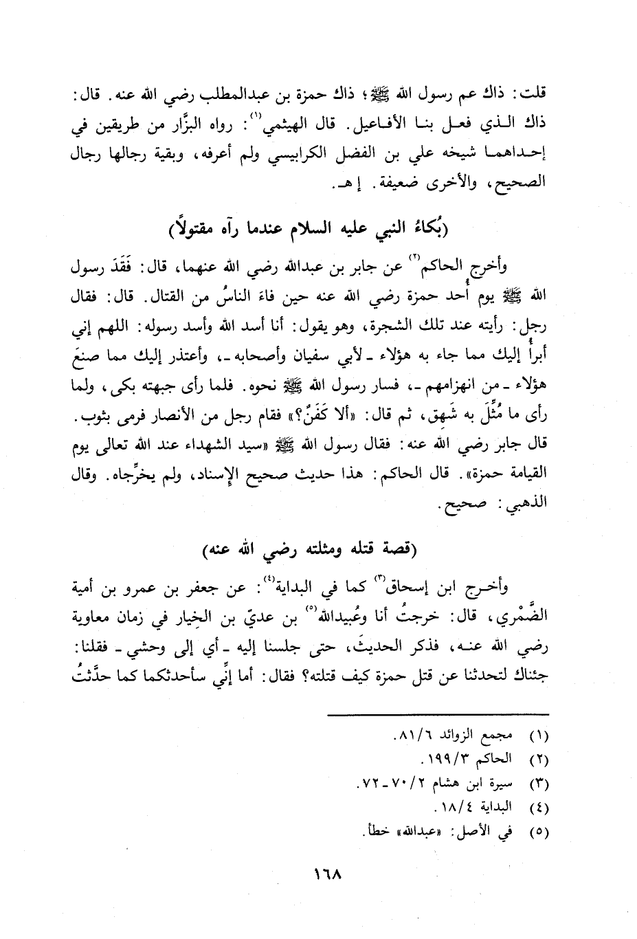وأخرج الحاكم: عن جابر بن عبد الله رضي الله عنهما قال: فَقَدَت يوم أُحد حمزة رضي الله عنه حين فاء الناس من القتال. قال: فقال رجل: رأيته عند تلك الشجرة، وهو يقول: أنا أسد الله وأسد رسوله: اللهم إني أبرأَ إليك مما جاء به هؤلاء - لأبي سفيان وأصحابه -، وأعتذر إِليك مما صنع هؤلاء - من إنهزامهم -، فسارت نحوه. فلما رأى جبهته بكى، ولما رأى ما مُثِّلَ به شَهِق، ثم قال: «ألا كفَنٌ؟» فقام رجل من الأنصار فرمى بثوب. قال جابر رضي الله عنه: فقال رسول الله صلى الله عليه وسلم «سيد الشهداء عند الله تعالى يوم القيامة حمزة» . قال الحاكم: هذا حديث صحيح الإِسناد، لم يخرِّجاه. وقال الذهبي: صحيح.