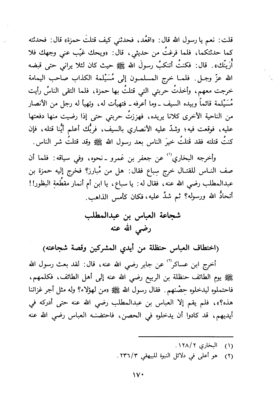 قلت: نعم يا رسول الله قال: «أقعُد، فحدثني كيف قتلت حمزة» قال: فحدثته كما حدثتكما، فلما فرغت من حديثي قال: «ويحك يجب عني وجهك فلا أُرَينّك» . قال: فكنت أتنكب رسول الله صلى الله عليه وسلم حيث كان لئلا يراني حتى قبضه الله عزّ وجلّ. فلما خرج المسلمون إِلى مُسَيْلمة الكذاب صاحبِ اليمامة خرجت معهم، وأخذت حربتي التي قتلت بها حمزة، فلما التقى الناس رأيت مُسَيْلمة قائماً وبيده لسيف - وما أعرفه - فتهيأت له، وتهيأ له رجل من الأنصار من الناحية الأخرى كلانا يريده، فهززتُ حربتي حتى إذا رضيت منها دفعتها عليه، فوقعت فيه؛ وشدّ عليه الأنصاري (فضربه) بالسيف، فربُّك أعلم أيُّنا قتله، فإِن كنت قتلته قلت خير الناس بعد رسول الله صلى الله عليه وسلم وقد قتلت شر الناس.