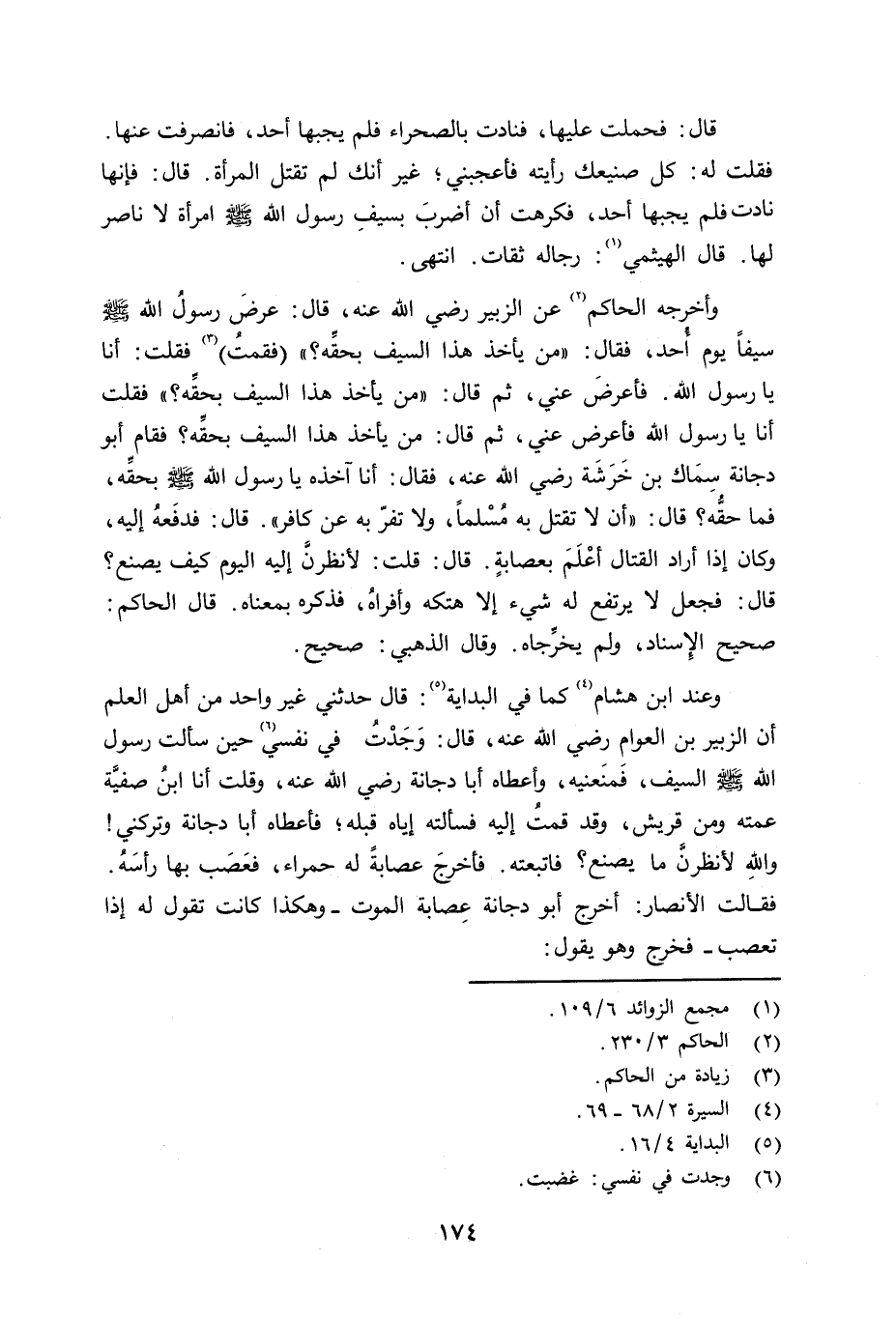 وأخرجه الحكم عن الزبير رضي الله عنه قال: عرض رسول الله صلى الله عليه وسلم سيفاً يوم أُحد فقال: «من يأخذ هذا السيف بحقِّه» ؟ (فقمت) فقلت: أنا يا رسول الله فأعرض عني. ثم قال: من يأخذ هذا السيف بحقِّه؟ فقام أبو دجانة سِمَاك بن خَرَشَة رضي الله عنه فقال: أنا آخذه يا رسول الله صلى الله عليه وسلم بحقِّه، فما حقُّه؟ قال: «أن لا تقتل به مسلماً، ولا تفرّ به عن كافر» . قال: فدفعه إليه، وكان إذا أراد القتال أعْلَم بعصابة. قال: قلت: لأنظرنَّ إليه اليوم كيف يصنع؟ قال: فجعل لا يرتفع له شيء إلا هتكه وأفراه - فذكره بمعناه. قال الحاكم: صحيح الإِسناد، ولم يخرِّجاه. وقال الذهبي: صحيح.